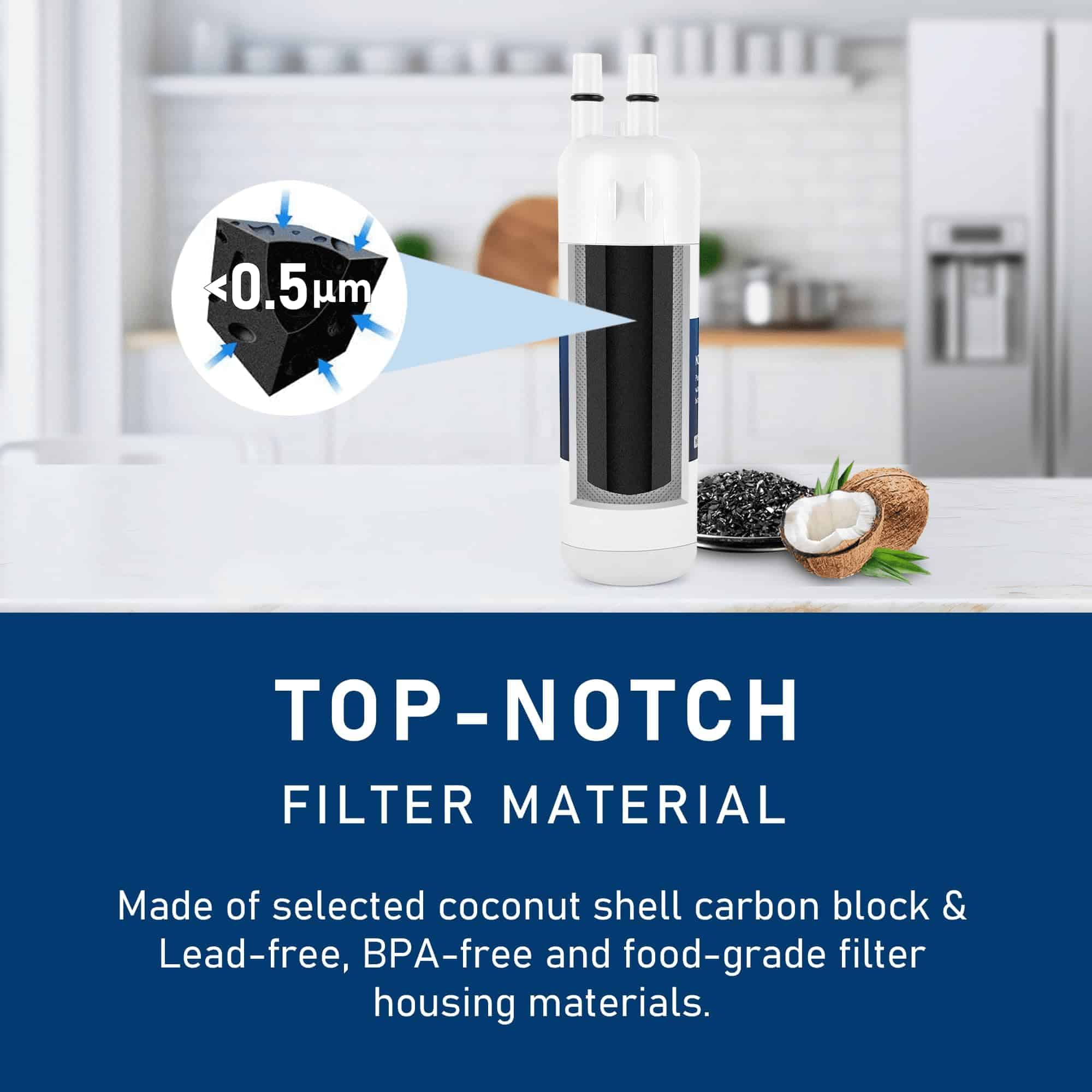 4. Material premium: hecho de un bloque de carbón de cáscara de coco seleccionado. Materiales de carcasa de filtro sin plomo, sin BPA y grado alimenticio.