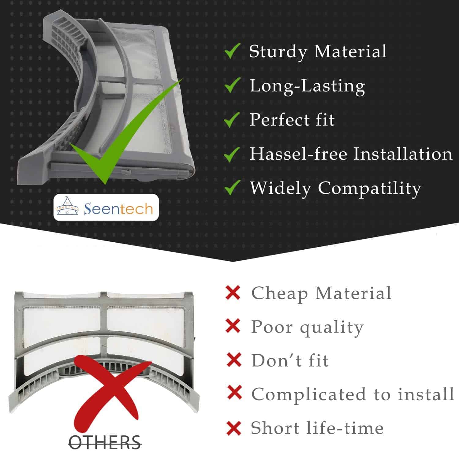 El filtro de trampa de pelusas para secadora DC61-02595A de alta calidad de Seentech es el reemplazo perfecto para mantener su secadora Samsung en su mejor rendimiento. Este filtro atrapa eficazmente las pelusas y los desechos que fluyen desde el viento de escape, evitando pérdidas y roturas. Compatible con varios modelos de secadoras Samsung, como DV42H5000EW/A3, DV42H5000GW, DV42H5200EW, DV45H6300EG/A3 y más. Asegúrese de confirmar la compatibilidad antes de ordenar para una total satisfacción garantizada. ¡Ordene ahora y mantenga su secadora funcionando de manera eficiente!
