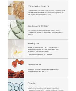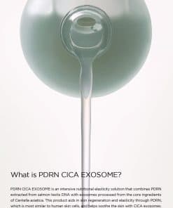 PDRN CICA EXOSOME es una solución intensiva de elasticidad nutricional que combina PDRN extraído del ADN de testículos de salmón con exosomas procesados a partir de los ingredientes principales de Centella asiática. Este producto ayuda en la regeneración y elasticidad de la piel a través de PDRN, que es más similar a las células de la piel humana, y ayuda a calmar la piel con exosomas de CICA. PDRN (ADN de Sodio) 1%: ADN extraído de los testículos de salmón, que tienen una estructura similar al cuerpo humano, es un ingrediente especializado para el cuidado de la regeneración y elasticidad de la piel. Exosome de CICA 1,000ppm: Procesar exosomas a partir de extracto de Centella Asiática aumenta el crecimiento y movimiento celular y ayuda a calmar la piel. Melaway 1%: Un material crudo patentado que suprime la producción de melanina y ayuda con antioxidantes cutáneos con ingredientes vegetales activos de iluminación. Número de Registro de Patente No. 10 – 2539209. Astaxantina-W: Astaxintina, un poderoso antioxidante extraído de la microalga Haematococcus – W. Oligo-Ha: Ácido hialurónico patentado de ultra bajo peso molecular que aumenta la penetración de la piel, aumenta el grosor epidérmico y promueve la activación de las células madre. Realizó una prueba clínica hipoalergénica completa, por lo que se puede usar de forma segura incluso en piel sensible. Instrucciones: Después de usar el tónico, tome una cantidad adecuada, extiéndalo uniformemente sobre la piel y golpéelo ligeramente para que lo absorba. CONSEJO de uso más efectivo: Bombee dos o tres sérums, espárcalos uniformemente sobre la piel, colóquelos en el área problemática y aplíquelos nuevamente. Puede usarlo de manera más efectiva aplicando un suero en áreas que requieran nutrición intensiva y colocando una máscara. No contiene colorantes artificiales, ni saborizantes artificiales.