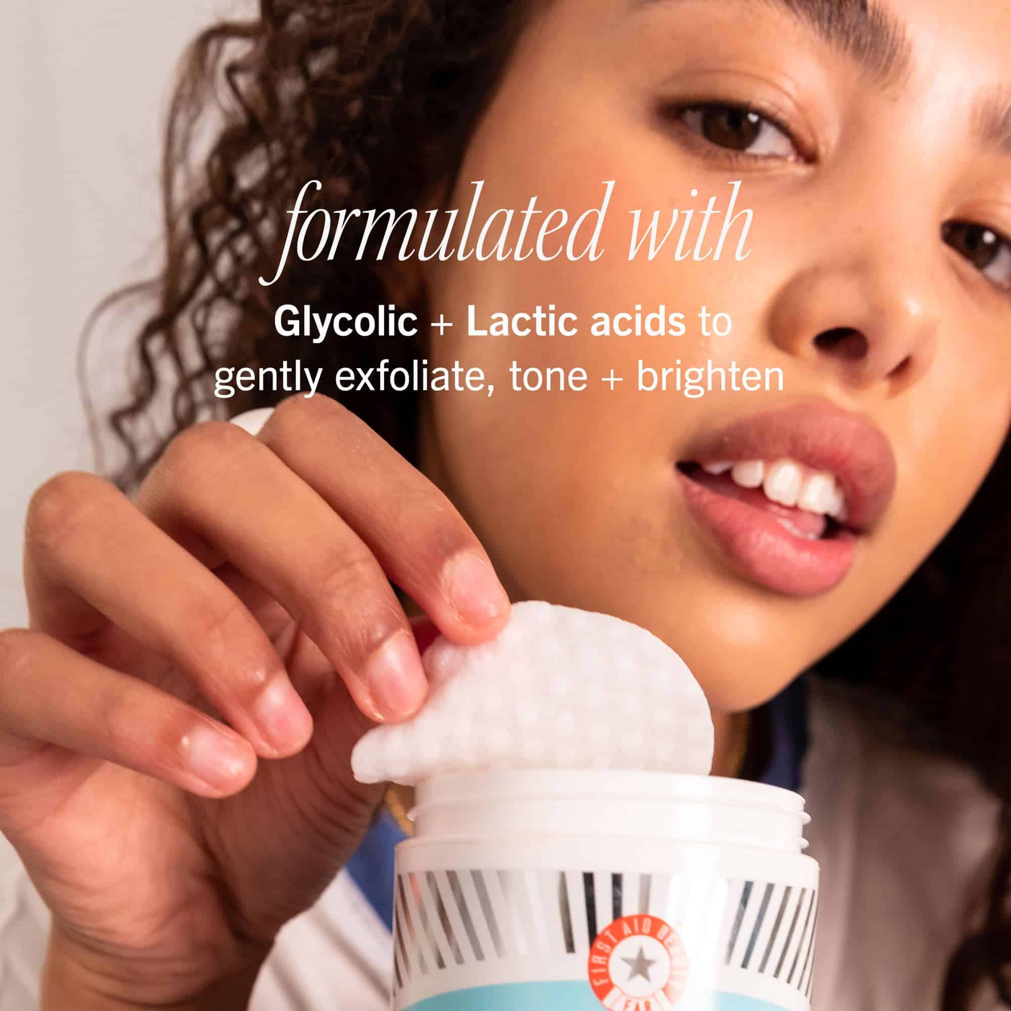 1. Seguro, Suave + Efectivo: Un pad de tratamiento diario que contiene la cantidad justa de Ácidos Láctico y Glicólico para exfoliar, tonificar e iluminar de forma segura y efectiva todo tipo de piel, incluida la sensible; aún mejor, estos pads son ahora compostables para uso diario.