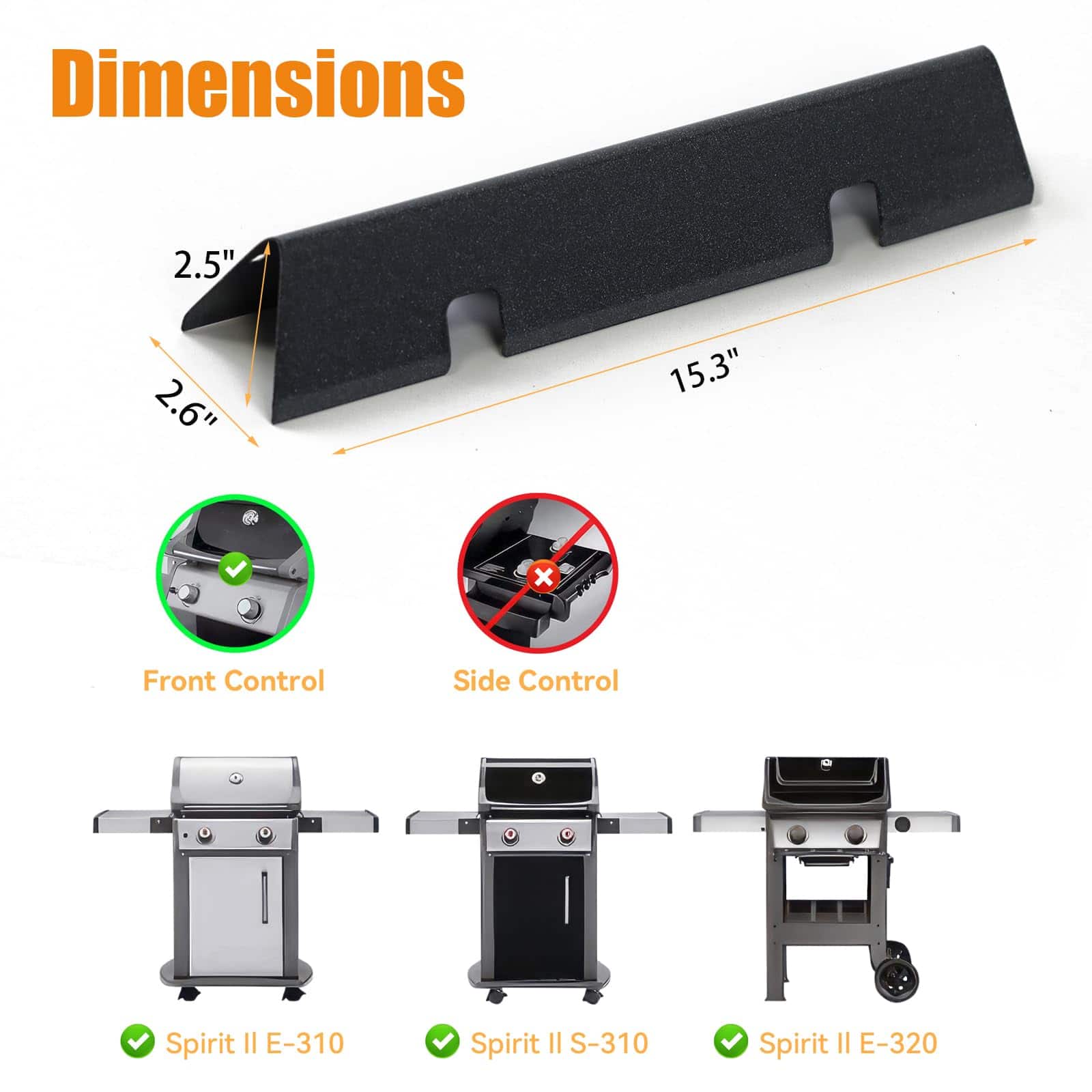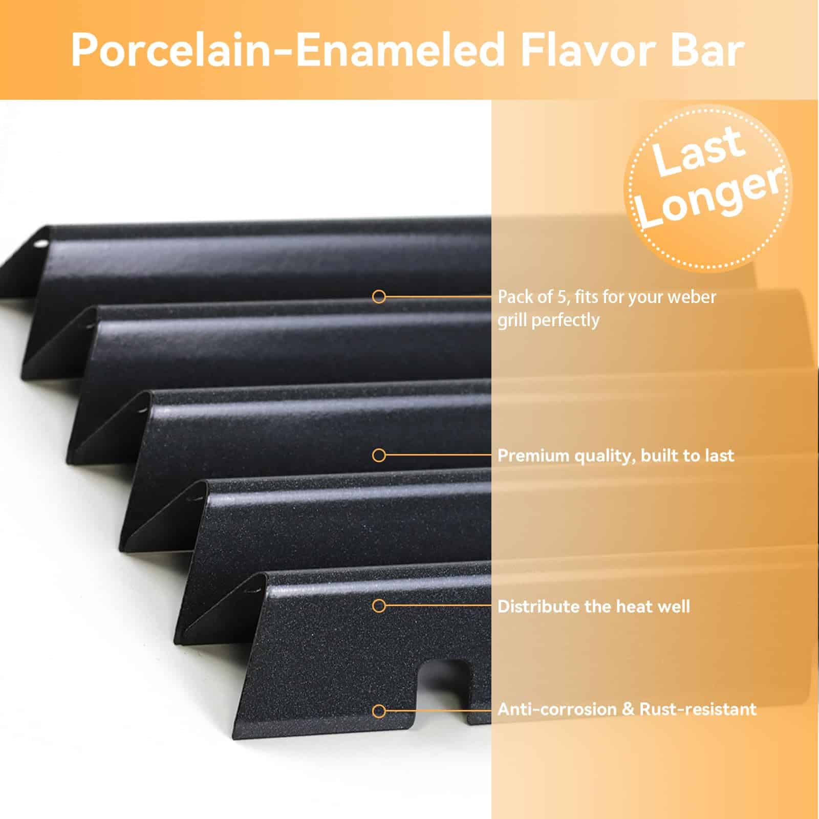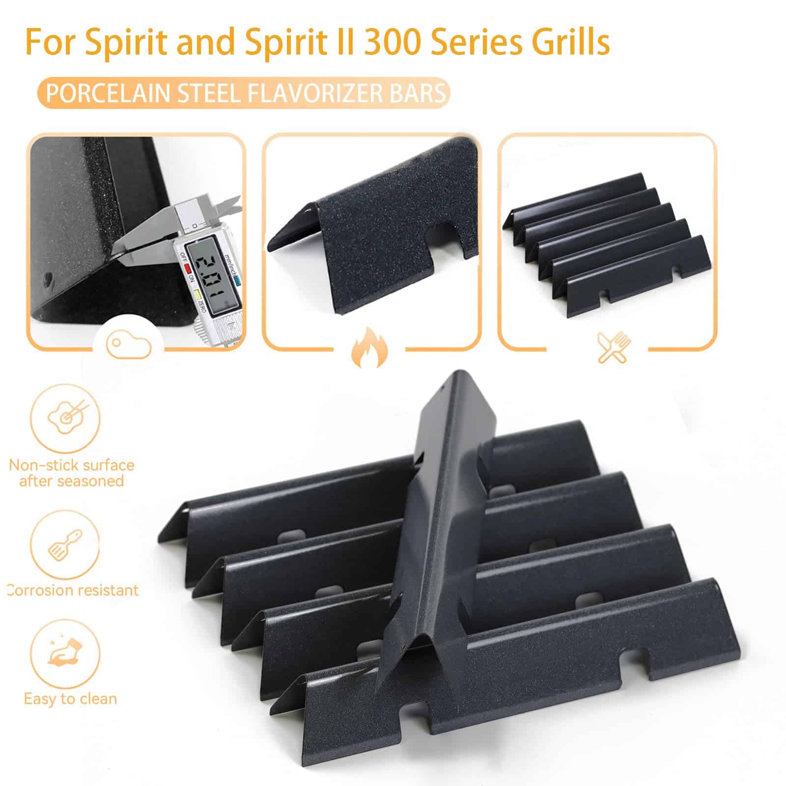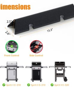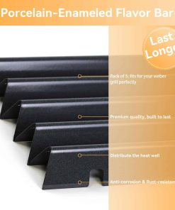 Este kit de piezas de repuesto también es compatible con parrillas de gas SP-310, SP-330 para las parrillas Weber Spirit II 300 Series (años modelo 2013 hasta la actualidad). No es compatible con modelos con panel de control lateral. Dimensiones de las barras saborizantes: L 15.3″ x An 2.6 x Al 2.5. Material: Acero esmaltado con porcelana. Paquete de 5 piezas. Compatible con el número de parte: Weber 7636. El diseño único de barras saborizantes Snow Point cuenta con un recubrimiento resistente a alta temperatura en la superficie para evitar que el recubrimiento se desprenda demasiado pronto y para agregar un sabor especial ahumado a los alimentos. El grosor de las placas de calor es de 16GA, más grueso que otras barras de 17GA-20GA, lo que las hace durar mucho más y proporcionar una mejor protección para la parrilla. Las barras saborizantes 7736 tienen cuatro muescas (dos en cada lado por barra saborizante), lo que significa que tienen más ventajas que otras barras saborizantes tradicionales: distribuyen el calor de manera uniforme, ventilan para una mejor combustión y permiten una observación más conveniente de la condición de la llama.