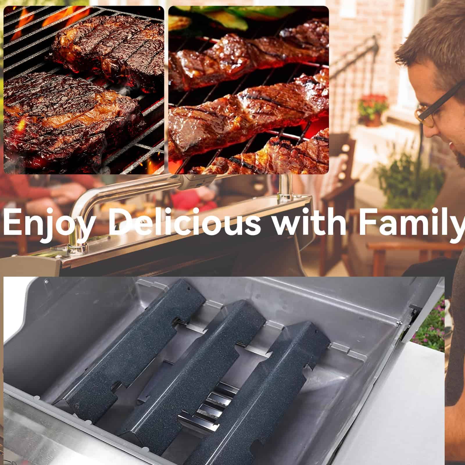 5. Limpieza Simplificada – Las barras saborizantes también ayudan a simplificar el proceso de limpieza después de asar. Recogen y dispersan los goteos, reduciendo la acumulación de grasa y suciedad dentro de la parrilla, haciendo que el proceso de limpieza sea más fácil y eficiente.