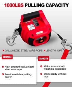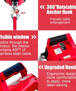 Una característica destacada de este winch es su diseño mejorado, que incluye una ventana visible para observar los cambios en el cable de acero, un gancho de anclaje giratorio y un gancho de cuerda para una operación segura y eficiente.