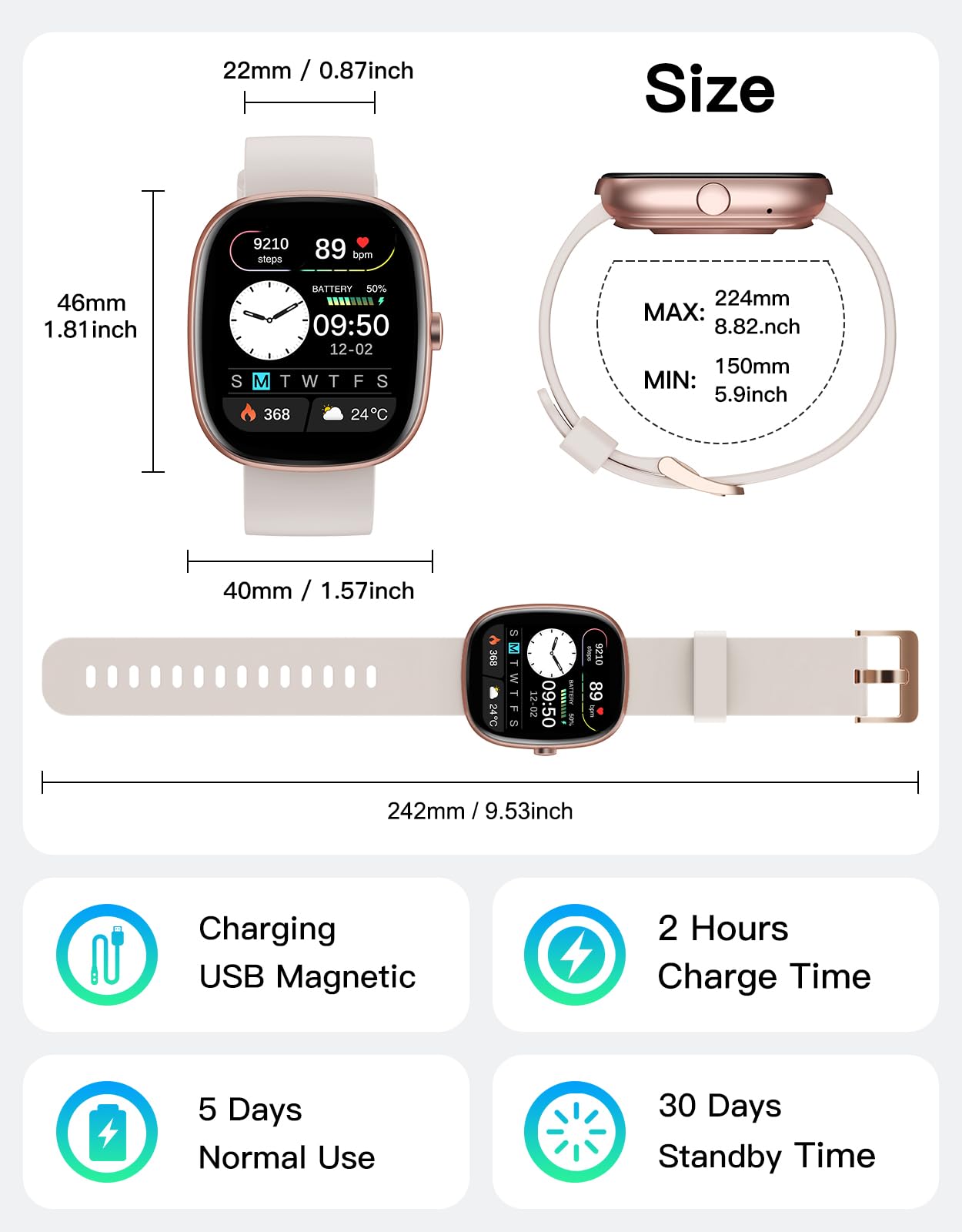 1. Smartwatch con Llamadas: Compatible con iPhone y teléfonos Android (iOS 9.0/Android 5.0 o superior). El altavoz y el micrófono incorporados te brindan un sonido claro al hacer o contestar llamadas desde la muñeca. 2. Notificaciones Inteligentes: Conecta el smartwatch a tu smartphone y configúralo a través de la app, las notificaciones de SMS y APP (Facebook, WhatsApp, Twitter, Instagram, etc.) se mostrarán en tu reloj en tiempo real (no se puede responder a mensajes de texto). Nunca te pierdas mensajes importantes. 3. Seguimiento de Actividad Todo el Día: Este rastreador de actividad monitoriza pasos, distancia, calorías quemadas y minutos activos automáticamente para ayudarte a alcanzar tus objetivos de fitness. 4. Rastreador de Actividad con 100+ Tipos de Deportes: Este reloj podómetro puede rastrear más de 100 tipos de deportes, incluyendo correr, caminar, ciclismo, baile, gimnasia, etc., proporcionando información en tiempo real para mantenerte en el buen camino. 5. Monitor de Ritmo Cardíaco y Oxígeno en Sangre y Seguimiento del Sueño: Este reloj de salud puede seguir tu ritmo cardíaco y nivel de oxígeno en sangre en tiempo real y analizar patrones de sueño para ayudarte a mejorar tu bienestar general. 6. Elegante Reloj de Fitness para Hombres y Mujeres: Este reloj de fitness está equipado con una pantalla táctil HD de 1.85 pulgadas, que te ofrece una sensibilidad super táctil y una calidad de imagen excepcional. Hay más de 200 esferas de reloj personalizadas en el centro del dial (también compatible con la carga de imágenes), para que siempre puedas encontrar la mejor para combinar con tu estilo. 7. Impermeable y Batería de Larga Duración: Diseño impermeable con clasificación IP68 para entrenamientos y actividades al aire libre. Disfruta de hasta 5 días de vida útil de la batería o 30 días en espera con una sola carga. 8. Funciones Más Prácticas: El reloj rastreador tiene una variedad de funciones, incluyendo alarmas, captura remota, ciclo fisiológico, buscador de teléfono, pronóstico del tiempo, control de música, cronómetro, temporizador, recordatorio de sedentarismo, calculadora y más.
