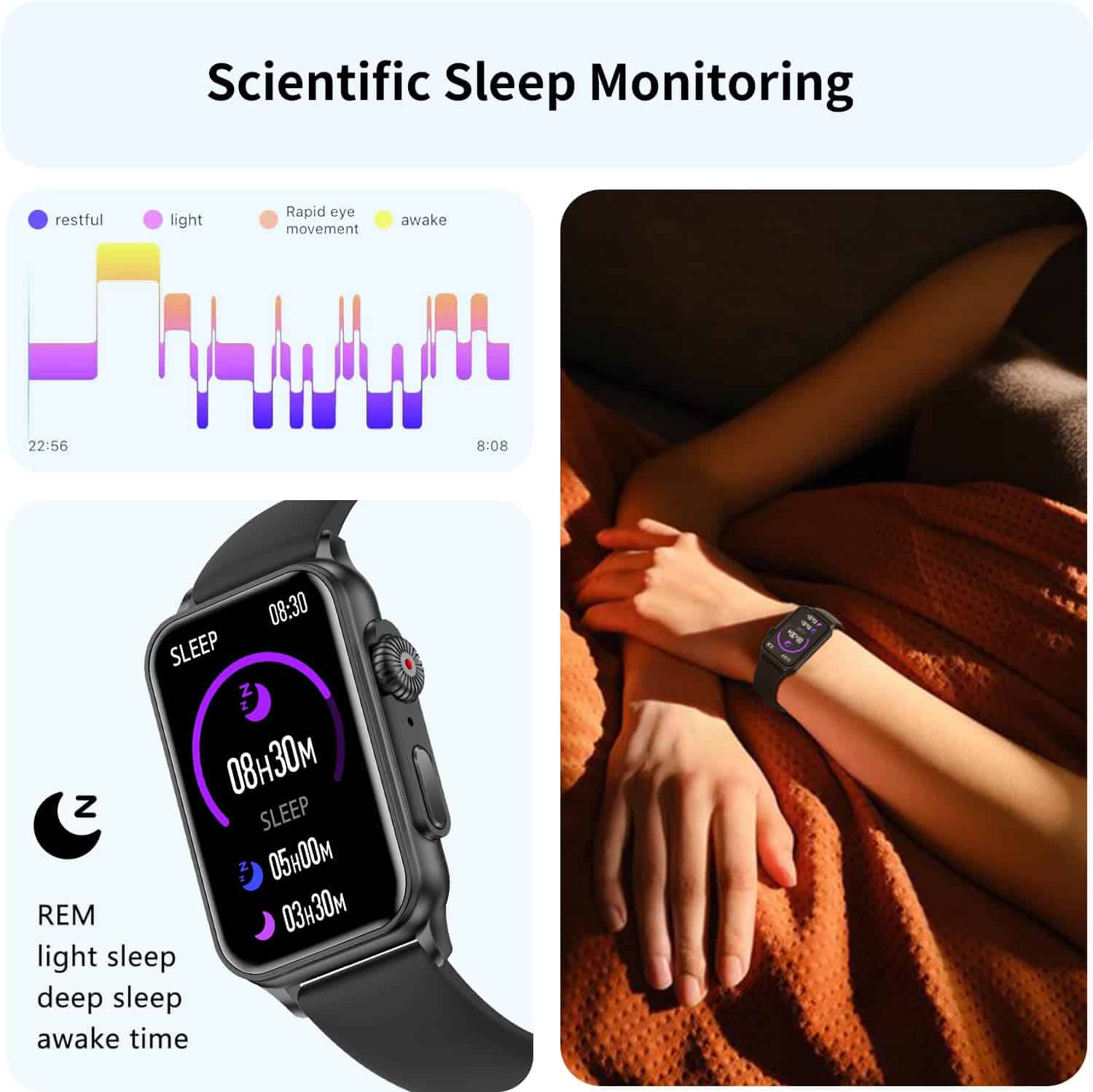 4. Monitor Científico del Sueño: Realiza un seguimiento automático de tus patrones de sueño de 8:00 pm a 10:00 am. El rastreador de actividad física FITVII proporciona información detallada sobre la estructura de tu sueño, incluyendo REM, sueño ligero, sueño profundo y horarios de despertar, lo que te ayuda a comprender y mejorar la calidad de tu sueño.
