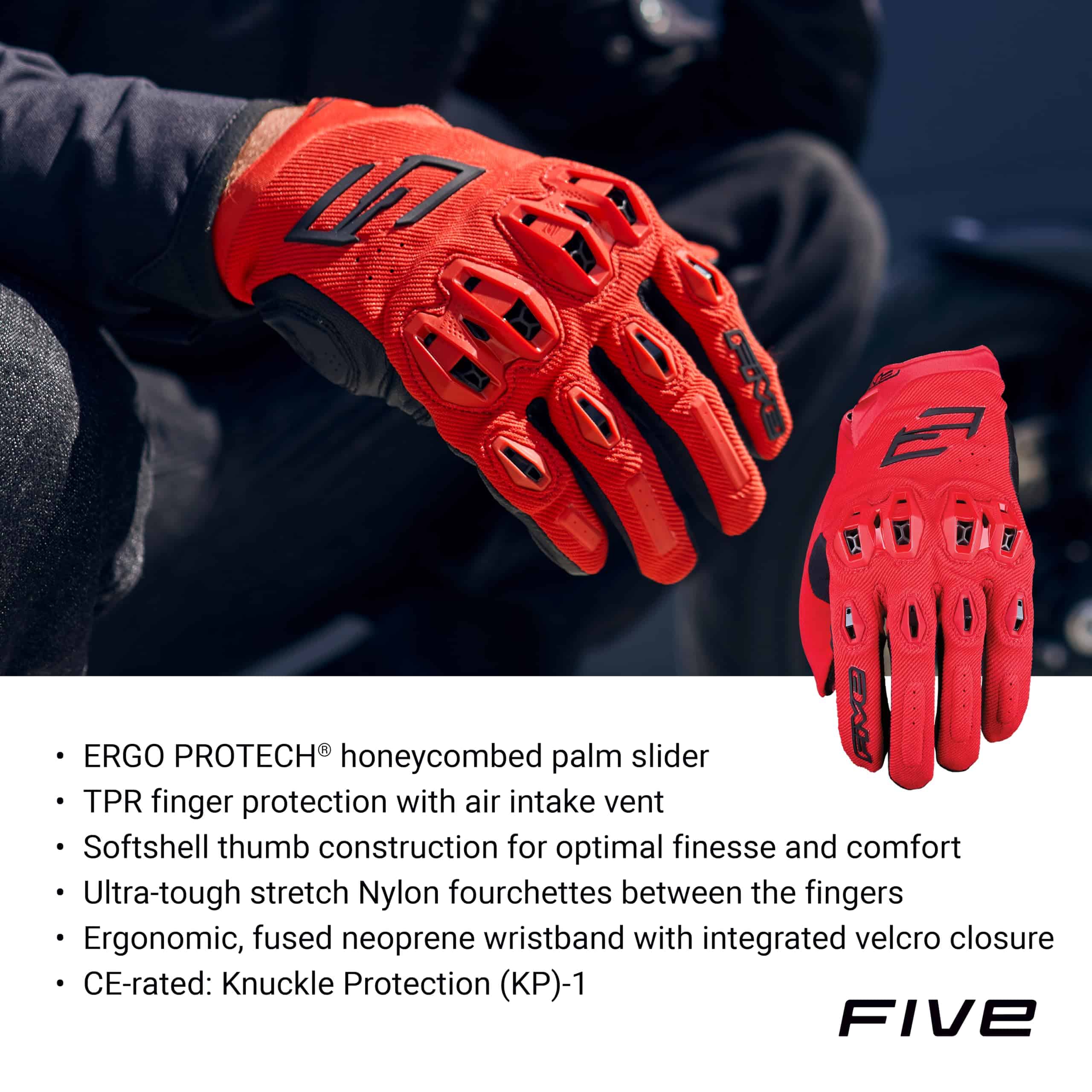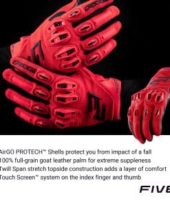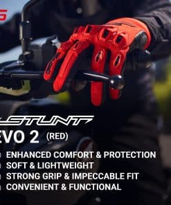 Inspired by helmet� technology – Stunt EVO 2 is FIVE Gloves� offering for riders who want both comfort and protection in their motorcycle gloves. Using AirGO PROTECH ergonomic shells, our riding gloves ensure safety against impact from falls. Durable build – Our men�s gloves are built for every hand, resisting wear and tear on the road. Full-grain goat leather palms and twill span topsides make our red motorcycle gloves supple and durable, adding softness and smoothness to the touch. Gloves with grip and control – These men�s motorcycle gloves have your safety on the road covered. Through its full-grain goat leather material, you�ll be able to grip better on the handlebars when riding and traveling. Touchscreen gloves – Whether for navigation or emergencies, Stunt EVO 2 allows you to use your phones and GPS devices with ease. FIVE Gloves� Touch Screen System allows you to never miss a beat while on the road wearing our motorcycle riding gloves. Make the right choice in motorcycle gloves – For almost 20 years now, FIVE Gloves has been helping riders enhance their enjoyment at the handlebar while protecting hands from injury in case of a fall, by equipping millions of motorcycle enthusiasts around the world with CE Certified gloves. Our commitment can be stated in three words: Protection, Fitting, and Design with comfort, level of protection, and durability in mind. Add our gloves to your beloved motorcycle gear.