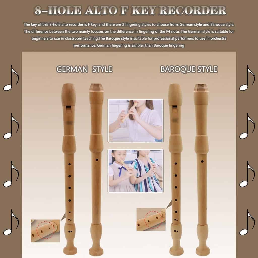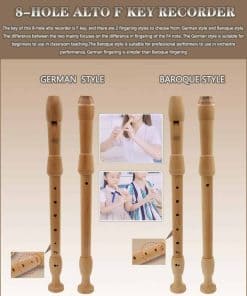 2. Flauta dulce Llave F de 8 agujeros: La tonalidad de esta flauta dulce de 8 orificios es en Llave F, y hay 2 estilos de digitación para elegir: estilo alemán y estilo barroco. La diferencia entre los dos se centra principalmente en la digitación de la nota F4. El estilo alemán es adecuado para principiantes para usar en la enseñanza en el aula, y el estilo barroco es adecuado para intérpretes profesionales para usar en presentaciones de orquesta. En comparación con la digitación barroca, la digitación alemana es más simple.