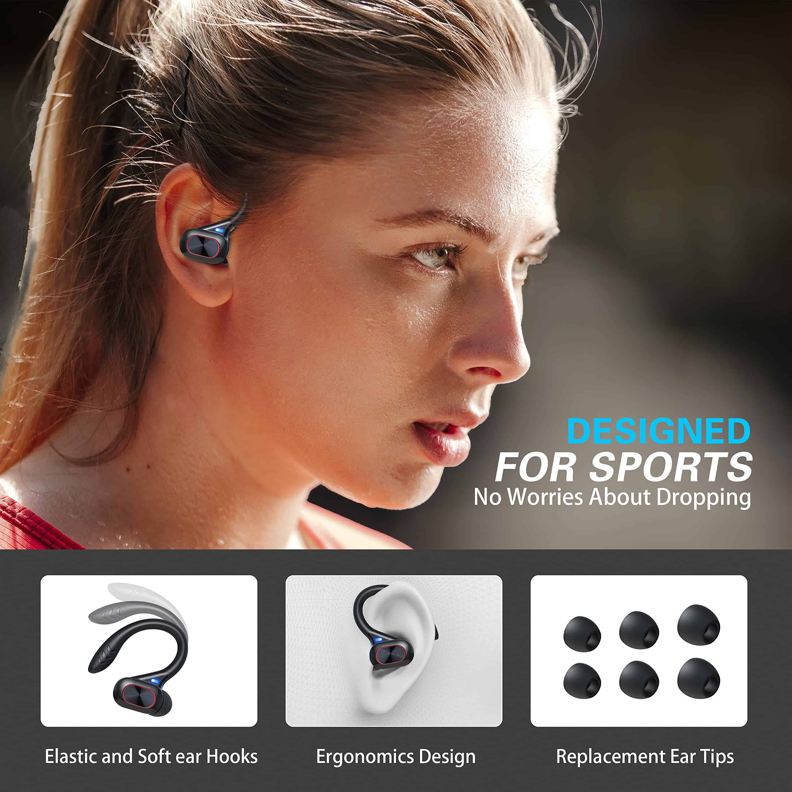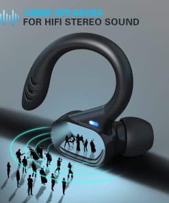 5. Conveniencia y Estilo: Nuestros elegantes auriculares negros con ganchos para la oreja ofrecen estilo, durabilidad y practicidad. La clasificación IPX65 te permite disfrutar de música y llamadas en cualquier clima. La pantalla LED en el estuche de carga muestra la vida de la batería, haciendo que estos auriculares sean perfectos para entrenamientos o en movimiento, garantizando una experiencia auditiva fluida.