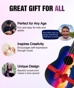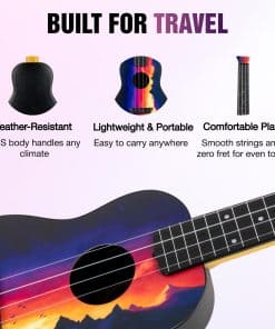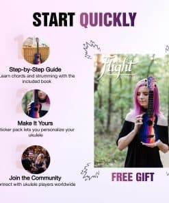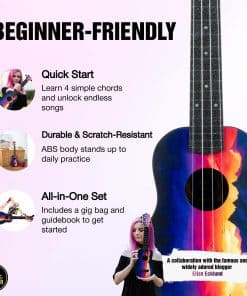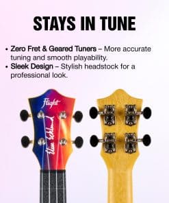 En su segunda colaboración con Flight Ukulele en un ukelele de firma, Elise Ecklund quiso capturar los diversos sentimientos evocados por un atardecer. Como edición especial del bien recibido Ukelele de Viaje de Flight, el Ukelele de Viaje Elise Ecklund Sunset presenta una tabla de tilo con un cuerpo y mástil de ABS. Gracias a su construcción, el ukelele de viaje tiene más volumen que el ukelele soprano promedio, al mismo tiempo que resuena mejor y suena más brillante. Es duradero y resistente a los cambios de humedad, los principales enemigos de los ukeleles de madera. Nunca experimentarás un traste afilado o un mástil doblado con ninguno de los Ukeleles de Viaje de Flight. La superficie del mástil presenta un patrón de madera para una mejor experiencia táctil. Una cejuela cero y un puente con cejuela removible mantienen la acción de las cuerdas baja y la entonación precisa. El diseño del clavijero es una parte integral de la identidad de los ukeleles de Flight. El chapado del clavijero del TUS-EE está hecho de tilo y coincide con el diseño de la tabla de sonido. Las clavijas engranadas siempre se mantendrán afinadas y el ukelele también viene con cuerdas Aquila Sugar y un botón de correa único en la parte inferior del ukelele. Como toque final, el Ukelele de Viaje Elise Ecklund Sunset viene con una bolsa de transporte azul que complementará tu estilo y hará que la bolsa se destaque en una multitud.