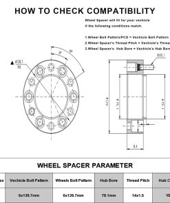 Especificaciones del Separador de rueda Cantidad: Cuatro (4) Grosor: 2″ Patrón de pernos: 6×5.5 a 6×5.5 Buje central: 78.1mm Rosca: 14×1.5 Material: Aluminio de grado aeroespacial 6061-T6 con pernos de grado 12.9. EL PAQUETE INCLUYE 4 x separadores de ruedas (2″ por unidad) 2 x bloqueo de roscas de alta resistencia (rojo) 2 x manual del usuario. Observaciones: Una caja de color incluye 2 separadores de ruedas, 1 bloqueo de roscas y 1 manual del usuario. Función: Aumentar el espacio libre para ruedas más grandes o más anchas y mejorar las características de manejo y estabilidad, así como el espacio para frenos. Dar a su vehículo una apariencia más agresiva. Compatibilidad 1999-2018 Chevrolet Silverado 1500 2001-2018 Chevrolet Tahoe 2007-2013 Chevy Avalanche 2003-2016 Chevy Express 1500 2002-2006 Chevy Avalanche 1500 2000-2014 Chevy Suburban 1500 2007-2018 GMC Sierra 1500 2000-2019 GMC Yukon 2015-2019 GMC Yukon XL 2003-2014 GMC Savana 1500 1999-2019 Cadillac Escalade INFORMACIÓN DE SEGURIDAD IMPORTANTE Nunca retire los pernos instalados de fábrica en el adaptador de rueda. Nunca use una llave de impacto para la instalación del adaptador de rueda. No apile múltiples separadores/adaptadores en una sola rueda. Siga cuidadosamente las instrucciones de instalación incluidas en este paquete. El fabricante no asume ninguna responsabilidad por lesiones, daños o costos de reparación resultantes de una instalación o uso incorrectos.