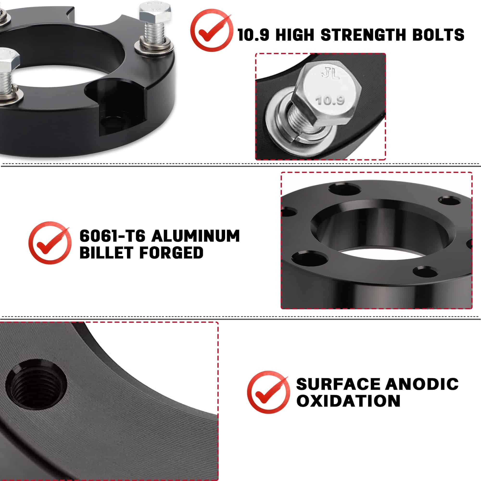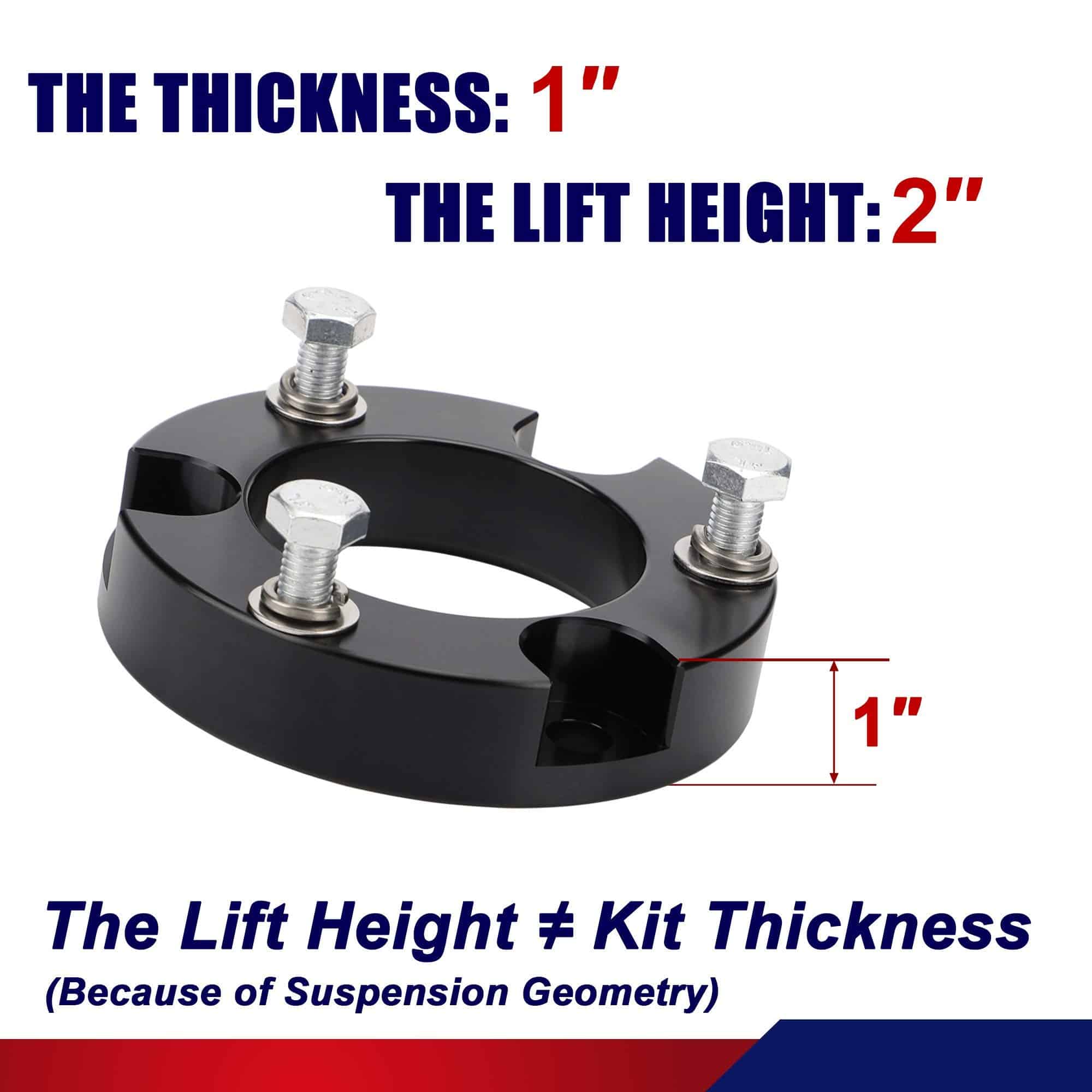 1. Aumenta la altura de tu camioneta: elevará la parte delantera de tu camioneta en 2 pulgadas, Debido a la geometría de la suspensión, la proporción entre la altura de elevación y el espesor del kit no es 1:1.