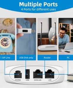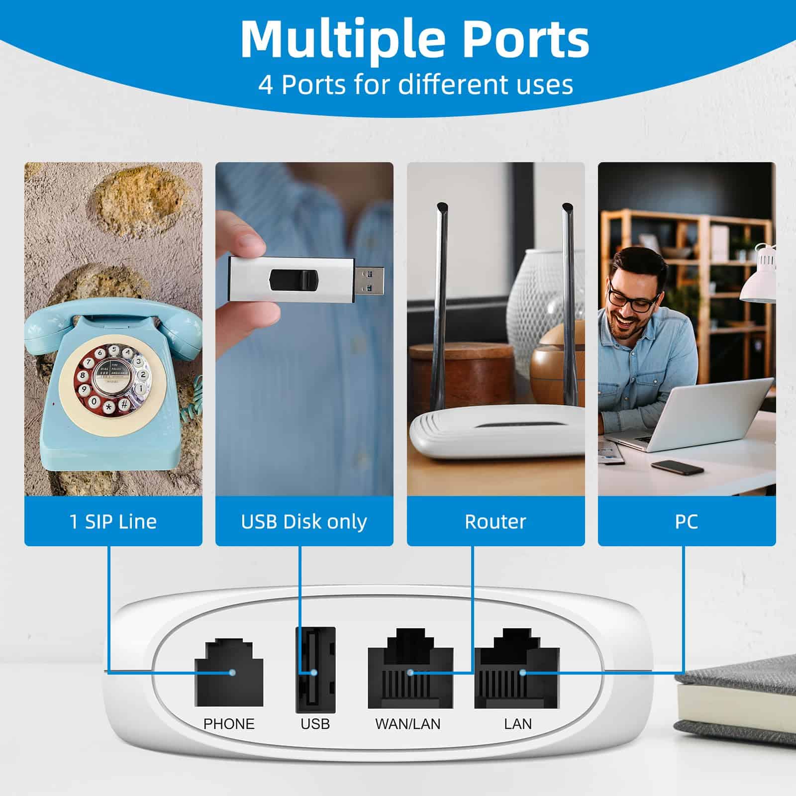 2. Configuración de puerto versátil y soporte SIP: Equipado con 1 puerto WAN, 1 puerto LAN, 1 FXS y 1 puerto USB, este adaptador VoIP permite llamadas SIP, compartición de IP y conexiones de alta calidad con soporte de QoS para teléfonos analógicos. El puerto USB también soporta la compartición de archivos y datos, ofreciendo una solución VoIP todo en uno para empresas y usuarios de trabajo en casa. (Este ATA FTA1101 tiene 1 línea SIP).