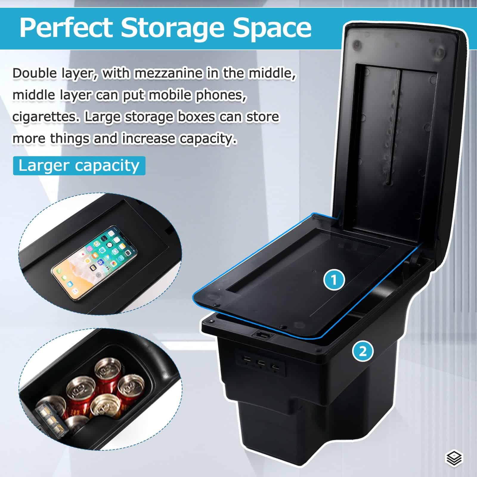 4. Carga USB y Espacio de Almacenamiento Perfecto Con 3 puertos de carga USB, podrás cargar varios teléfonos móviles al mismo tiempo. La luz azul se encenderá al cargar. El espacio de almacenamiento de doble capa te permite guardar tus objetos de valor o privados.