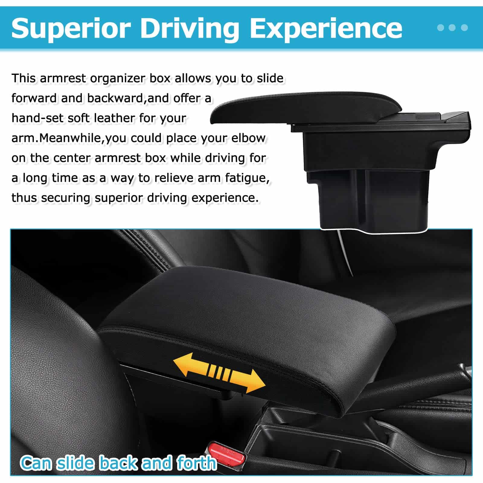 3. Experiencia de Conducción Superior Esta caja organizadora de apoyabrazos te permite deslizarte hacia adelante y hacia atrás, y ofrece un suave acolchado de cuero para tu brazo. Además, podrás apoyar el codo en la caja del apoyabrazos central mientras conduces durante mucho tiempo, como una forma de aliviar la fatiga del brazo, asegurando así una experiencia de conducción superior.