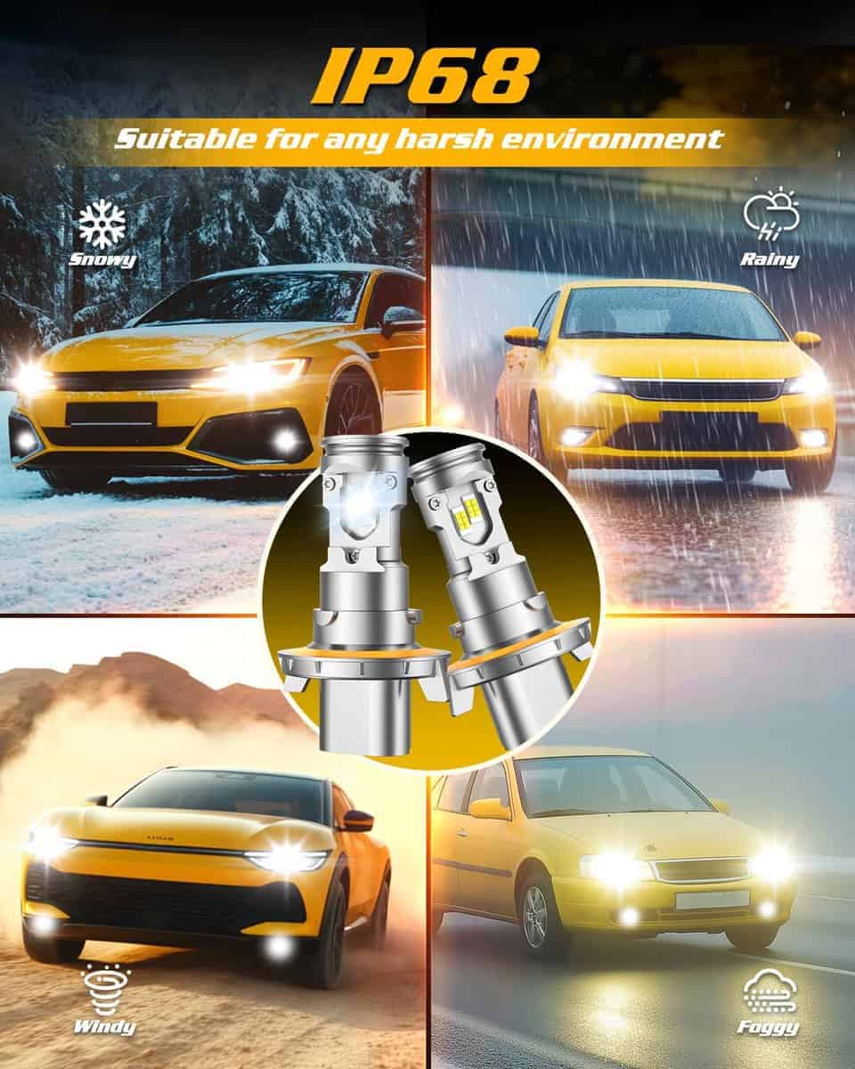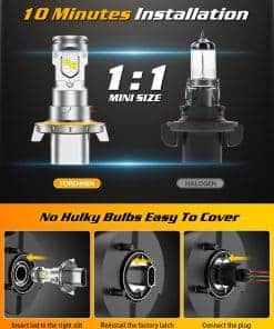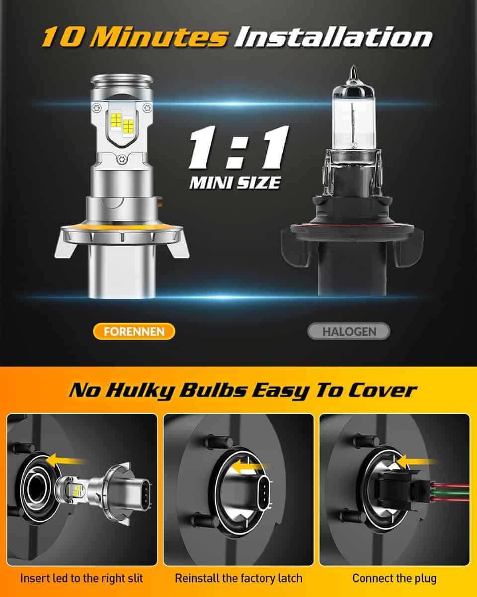 2. Instalación Fácil de 10 Minutos, Listo en Seguida ¡Adiós a los procesos de instalación complicados! Nuestras bombillas para faros antiniebla H13 cuentan con un tamaño mini 1:1, no se requiere controlador o conector externo, con enchufar y listo. Garantizando un ajuste perfecto para los zócalos de bombillas originales de su vehículo. El diseño plug and play hace que la instalación sea un juego de niños, incluso los principiantes pueden instalarlo en 10 minutos, ahorrándole tiempo y esfuerzo.