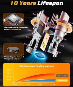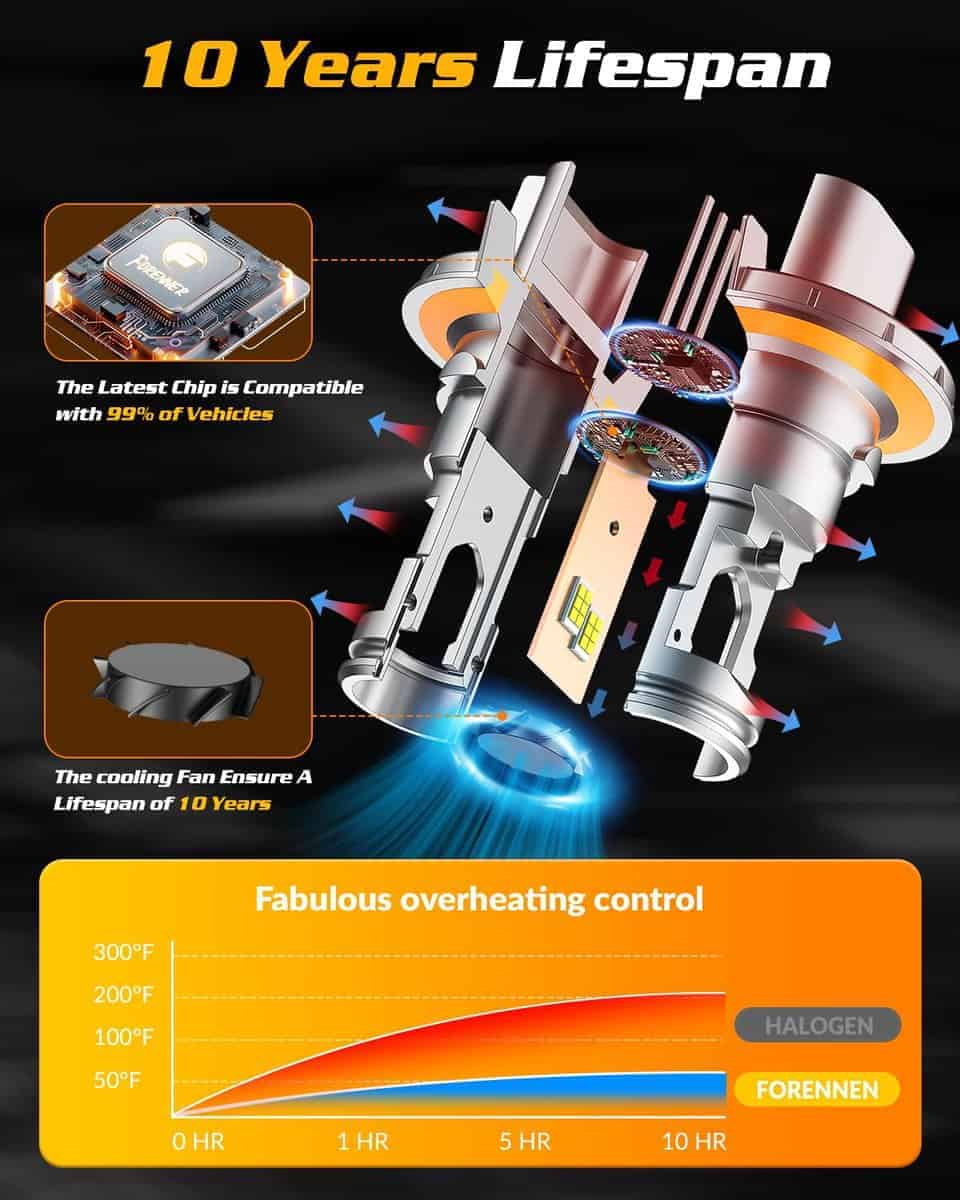 3. Durabilidad de 10 Años, Compañero Duradero Nuestras bombillas para faros antiniebla H13 están elaboradas con materiales premium como aluminio de aviación y una placa de base de cobre grande, estas bombillas garantizan más de 60,000 horas de iluminación continua y estable. Equivalente a un uso ininterrumpido todo el día durante aproximadamente 10 años y aún pueden funcionar normalmente. Nuestras bombillas para faros antiniebla 9008 están equipadas con un ventilador de enfriamiento de alta velocidad para disipar el calor y reducir la degradación de la luz, por lo que no necesita reemplazarlas con frecuencia.