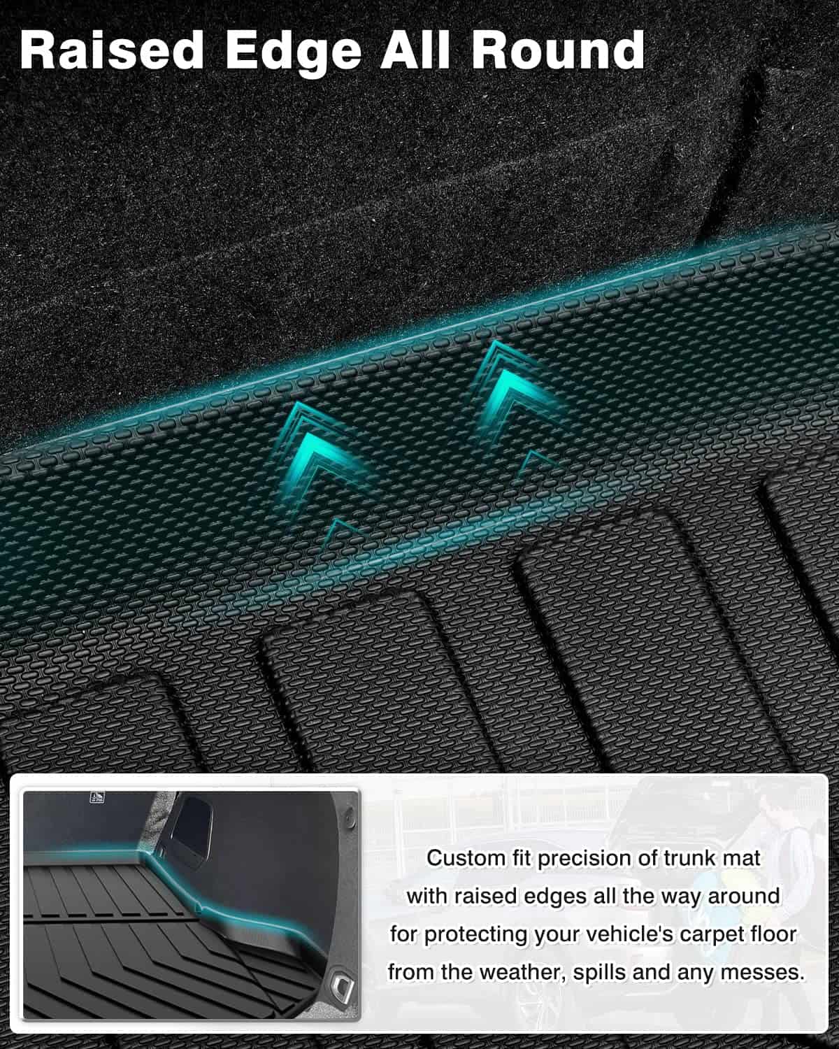 4. Laterales antideslizantes: El tapete del maletero tiene un labio elevado en todo el perímetro para evitar que líquidos y escombros lleguen a su suelo original. Asegúrese de que el desorden se quede en el tapete del maletero y no en su alfombra limpia original. Proteja su vehículo de todo tipo de daños.