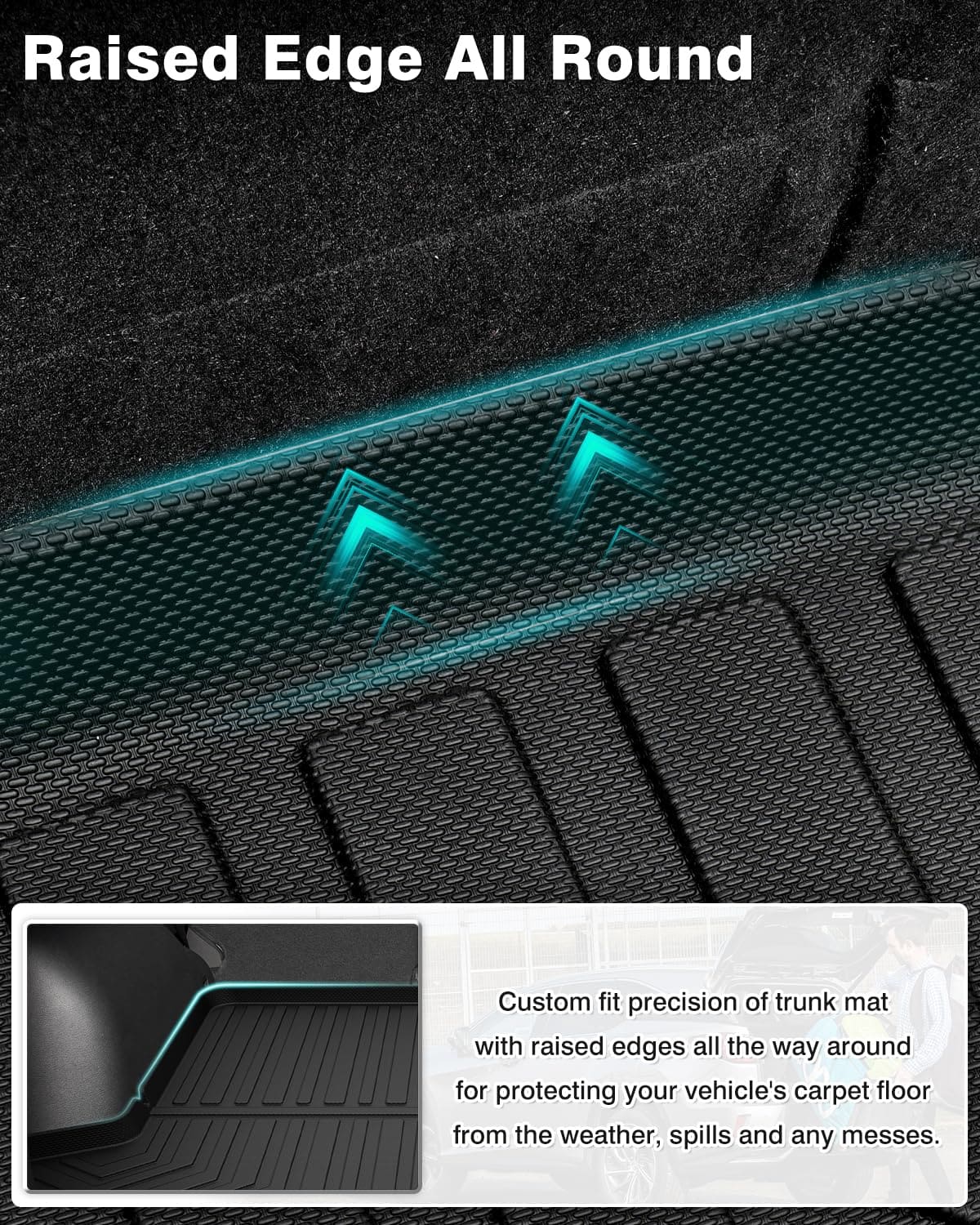 4. Laterales de bloqueo de derrames: El forro de maletero tiene un labio elevado alrededor para evitar que líquidos y residuos lleguen a su piso original. Asegúrate de que el desorden se quede en el forro y lejos de tu alfombra limpia original. Protege tu vehículo de todo tipo de daños.