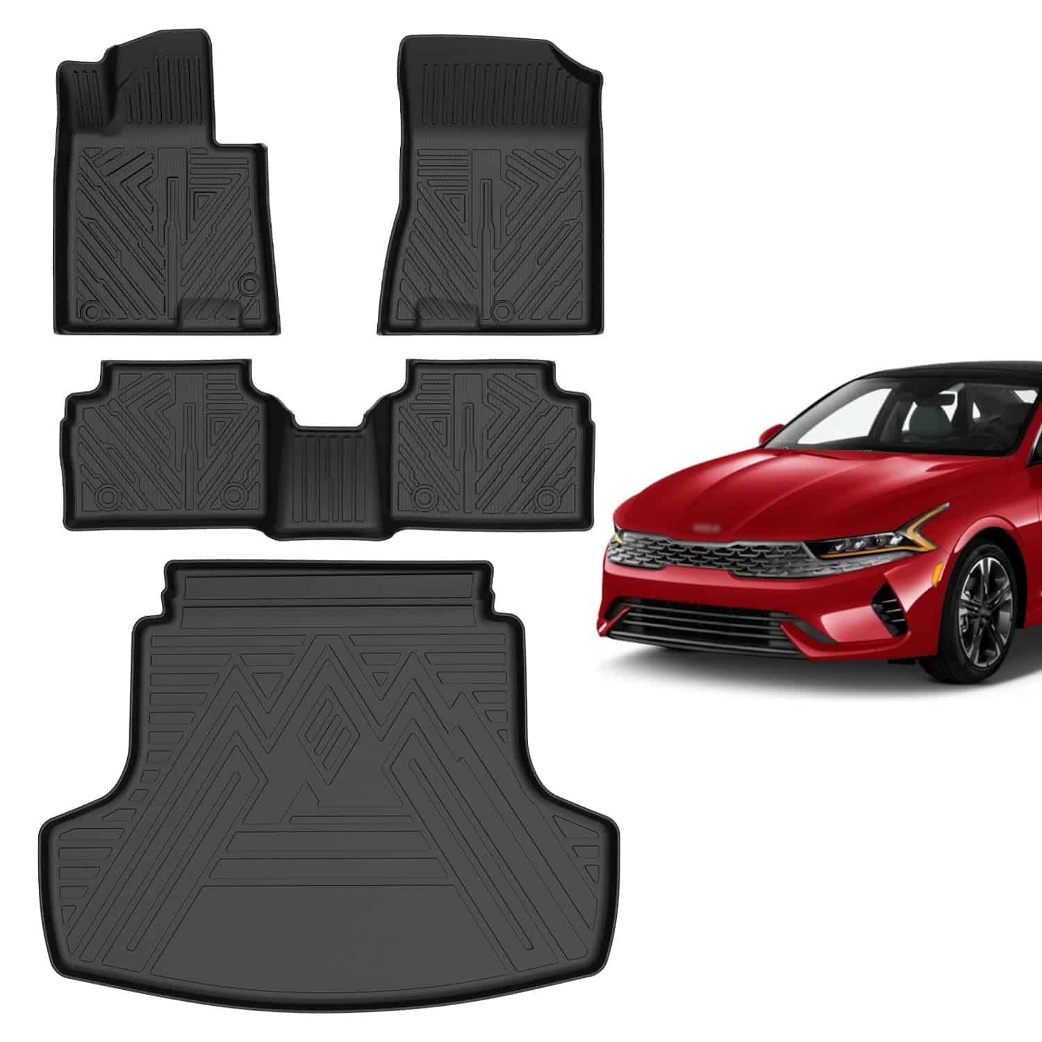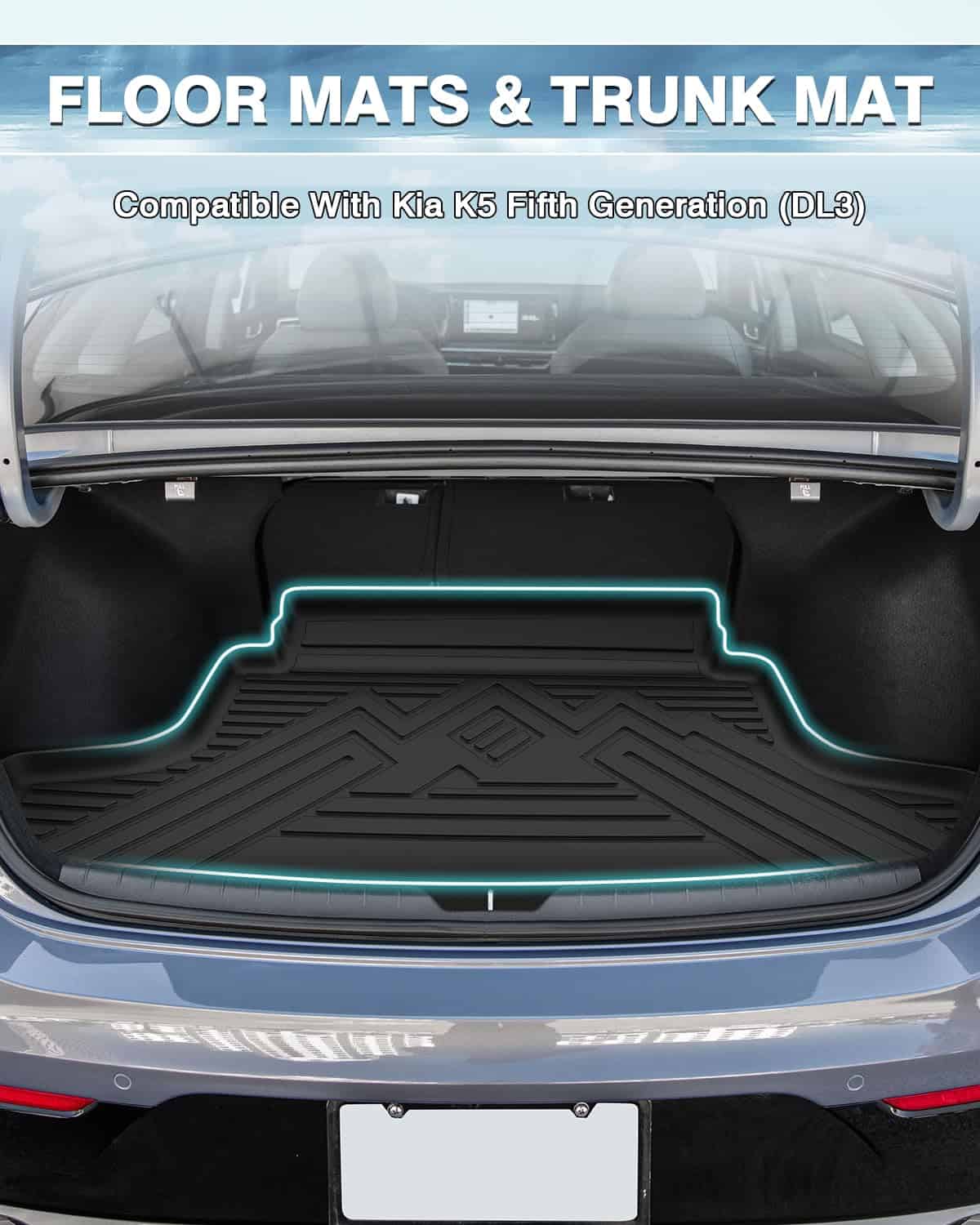 Forro de Carga y Tapetes de Piso para Hyundai Sonata 2020-2023, Kia K5 2021-2024. Este juego de tapetes de maletero y forros de piso es ideal para mantener su automóvil limpio y protegido de derrames, suciedad y desgaste. Hechos de materiales TPE premium, resistentes y seguros para el medio ambiente, estos accesorios ofrecen una excelente protección al interior de su vehículo. El diseño antideslizante y los canales de trampa de residuos hacen que estos tapetes sean perfectos para cualquier aventura. Además, su facilidad de limpieza los hace ideales para uso diario. No deje pasar la oportunidad de mantener su automóvil en perfectas condiciones con este forro de carga y tapetes de piso de alta calidad.