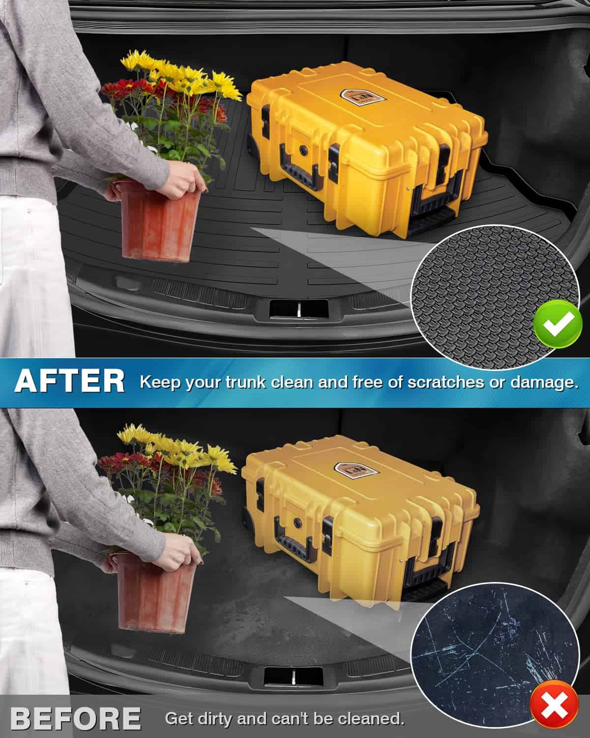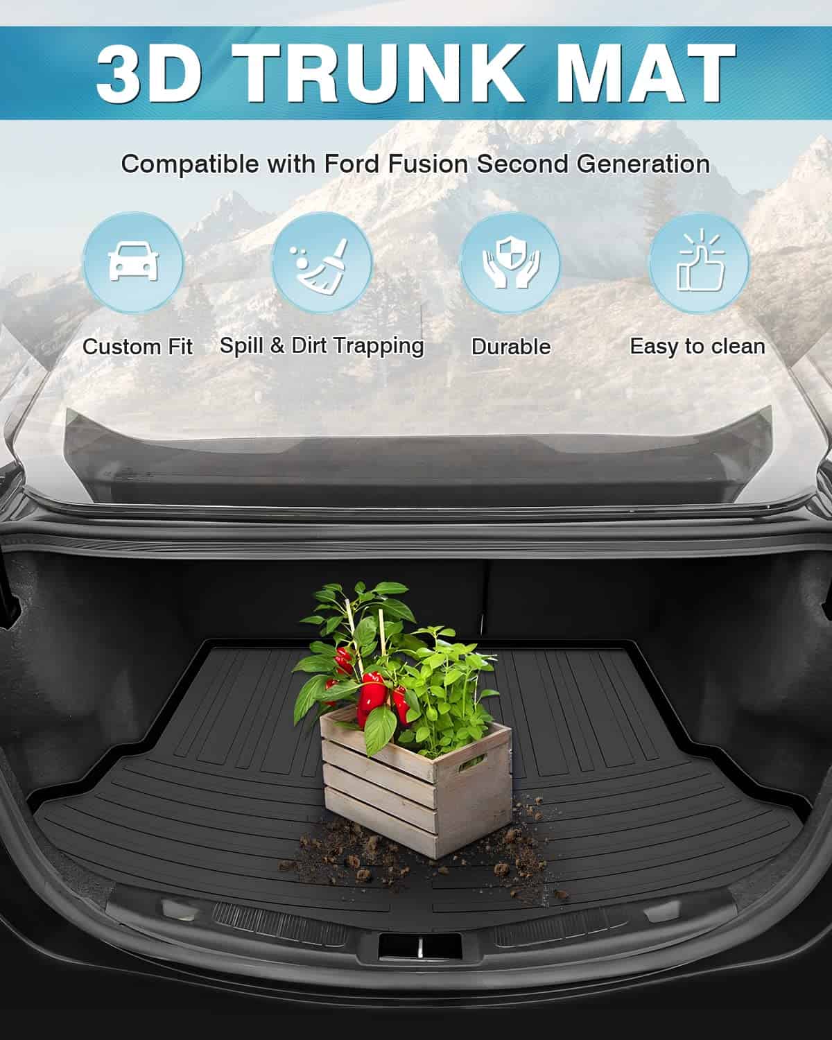 Cómo nuestra marca crea forros de piso y carga perfectamente ajustados – Nuestro Forro de carga evita que las manchas o desorden de cualquier tipo dañen su área de carga – Ofrece una protección contra la intemperie contra nieve, barro, arena, agua salada y más! – El diseño digitalizado 3D específico del vehículo está medido con precisión a las especificaciones exactas de la cabina (estamos hablando de menos de 1mm de espacio). – Los forros no solo repelen las manchas y la permeación del agua, sino que ofrecen una durabilidad de uso. – El respaldo antideslizante los mantiene en su lugar sin dañar su alfombra original. – Sus forros de carga en 3D están respaldados por una garantía de 12 meses. – Superficie texturizada duradera, no tóxica e inodora para una apariencia refinada y máxima protección interior. Paquete incluido: 1 forro de carga para Ford Fusion S, SE, Titanium 2013-2020, Ford Fusion Platinum 2017-2018, Ford Fusion Sport 2017-2020. Aviso: El forro puede estar deformado y tener un pliegue grande en el medio debido al embalaje y envío (doblado por la mitad), pero se resolvió fácilmente. Simplemente dejaste el forro en el camino bajo el sol durante 30 minutos y volvió a la forma original.