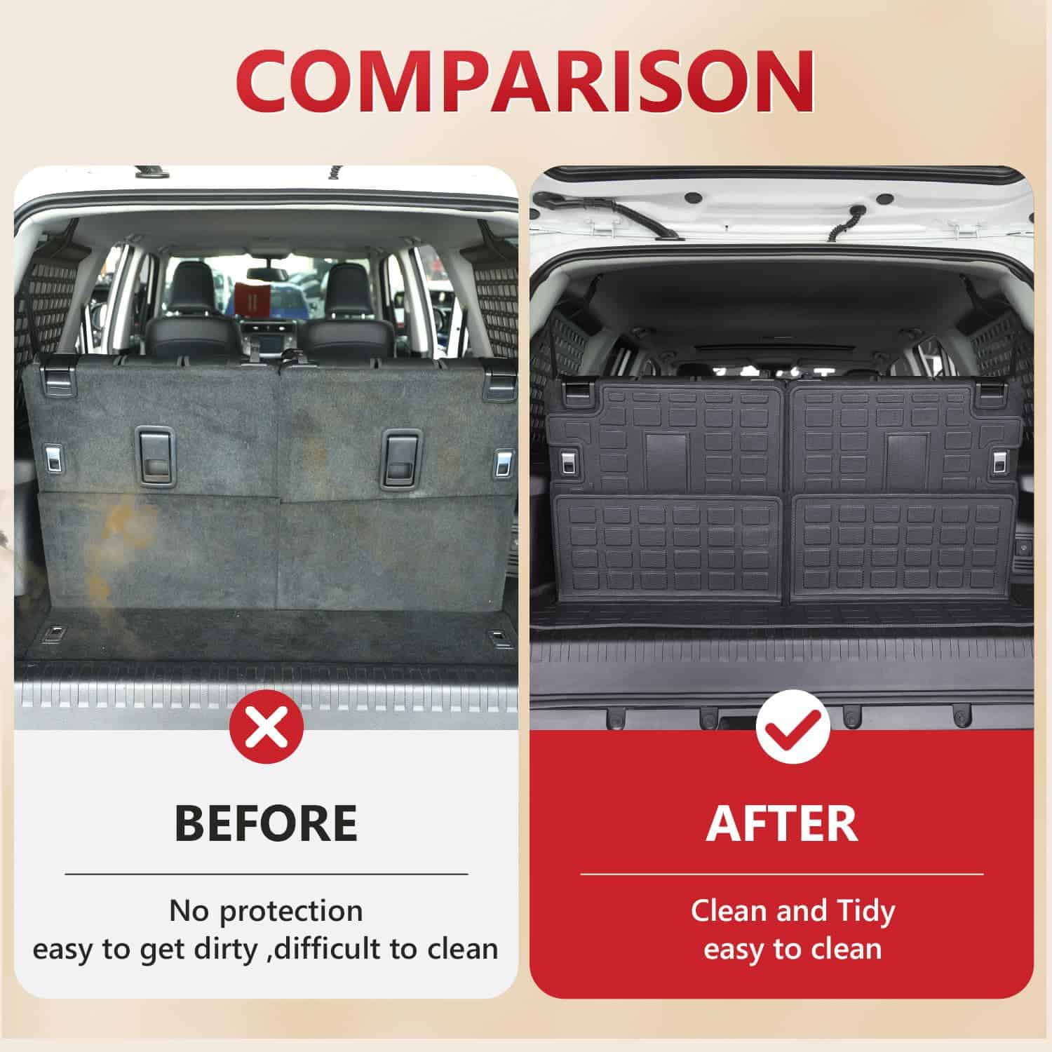 1. Ajuste exclusivo: Nuestro forro de maletero y alfombrillas para respaldo son compatibles con Toyota 4Runner 2010-2024. Atención: Se ajusta a modelos de 7 asientos. Las alfombrillas para respaldo se ajustan a los asientos de la tercera fila de 7 asientos.