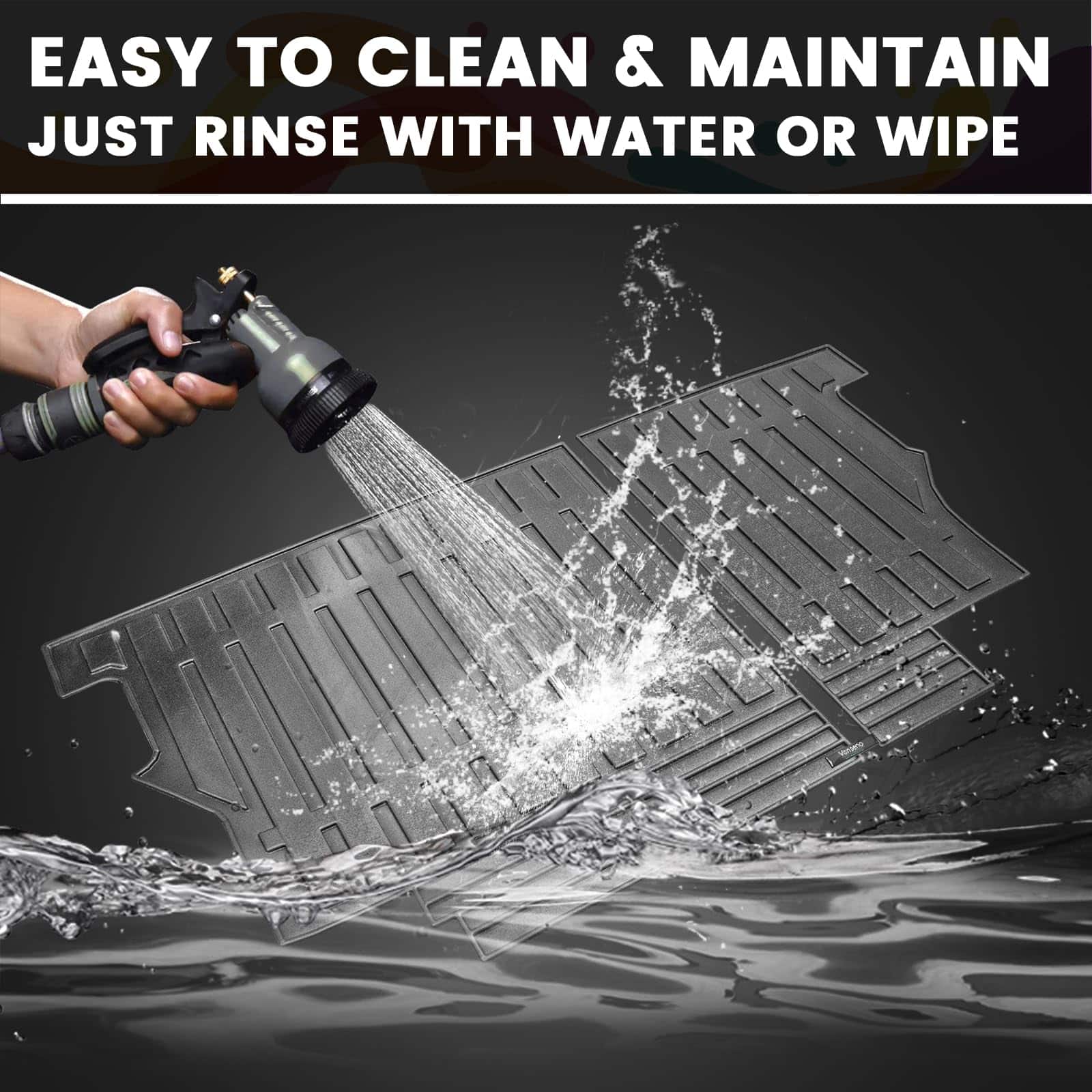 2. Material: Estos tapetes de maletero están hechos de TPE (Elastómero Termoplástico) de alta calidad, sin olor, seguro, resistente al frío y al calor, impermeable y a prueba de nieve, fácil de limpiar.