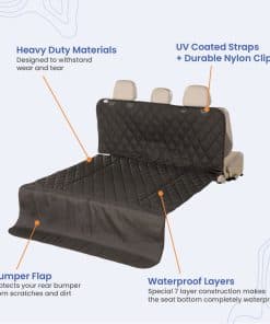 1. Tamaños para adaptarse a cualquier vehículo; Pequeño 46 x 82; Grande 52 x 86; X-Large 56 x 106 (las medidas incluyen una solapa de parachoques de 22 pulgadas); mida el área de carga para asegurarse de un buen ajuste. 2. Poliéster 600D resistente y resistente al color; correas gruesas recubiertas de rayos UV; clips de nylon duraderos; sin tintes azo ni metales pesados; esto no es a prueba de mordeduras. Por favor, no deje a su mascota en su vehículo sin supervisión. 3. Capa impermeable y antideslizante K9-Shield – La capa especial laminada impermeable no acolchada hace que la parte inferior del asiento sea completamente impermeable mientras que el respaldo antideslizante mantiene la cubierta en su lugar (las costuras no son herméticas). K9-Shield es una lámina textil especial desarrollada por 4Knines para proporcionar la máxima protección para su vehículo. 4. Se instala en segundos con clips de liberación rápida; enjuáguelo con manguera, límpielo con un paño húmedo o métalo en la lavadora para mantenerlo fresco y limpio. 5. ¡Los productos de 4Knines han estado superando y durando más que la competencia desde 2013!