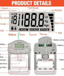 1. Medición precisa – Fuerza de agarre con sensor de alta precisión de calibre de tensión, puede medir con precisión la fuerza de agarre de hasta 198 lbs en divisiones de 0.2 lbs / 0.1 kgs.