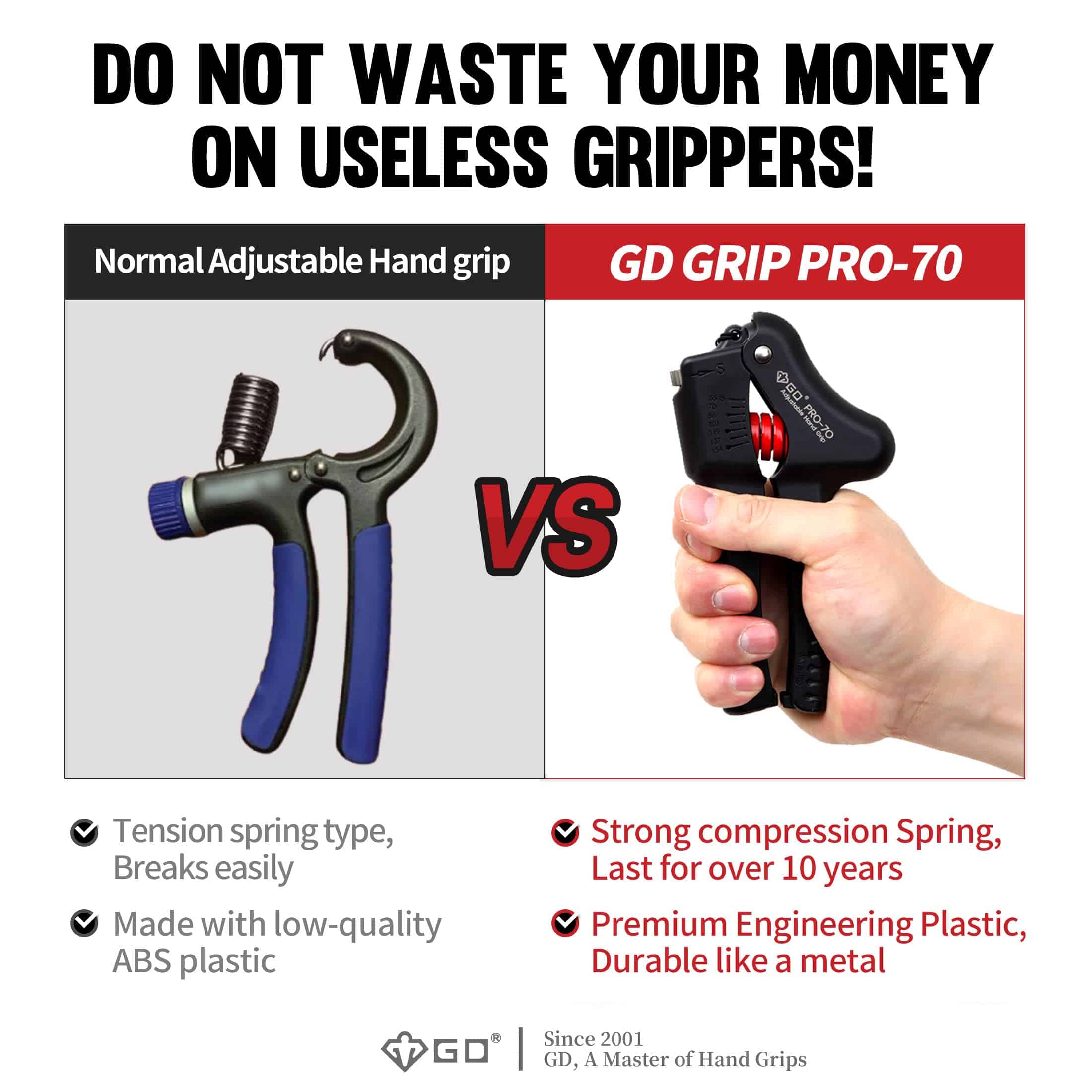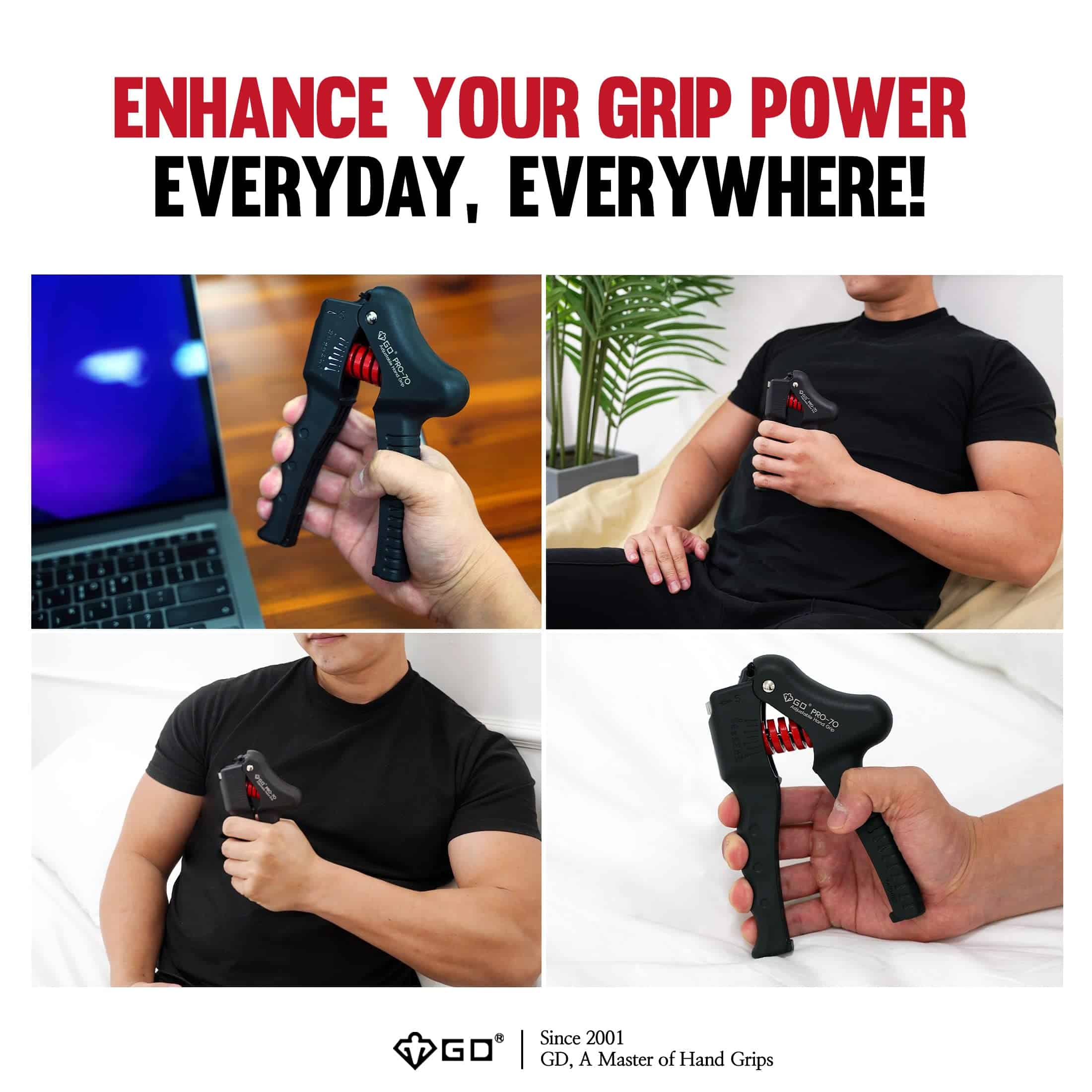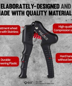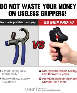 GD PRO-70 Hand Grip Strengthener es un entrenador de fuerza ajustable para muñeca y antebrazo que te ayuda a construir músculos y recuperarte de lesiones. Está fabricado con materiales de alta calidad que garantizan su durabilidad y resistencia. Puede ajustarse de 55 a 154 libras para adaptarse a tus necesidades de entrenamiento. Su diseño silencioso y portátil te permite usarlo en cualquier lugar y en cualquier momento. Además, ofrece un gran ahorro al proporcionar los mismos niveles de resistencia que varios fortalecedores de agarre manual en uno solo. Con resistencia confiable y patentado, el GD PRO-70 Hand Grip Strengthener es una excelente herramienta para mejorar tu fuerza de agarre y desarrollar tus músculos.