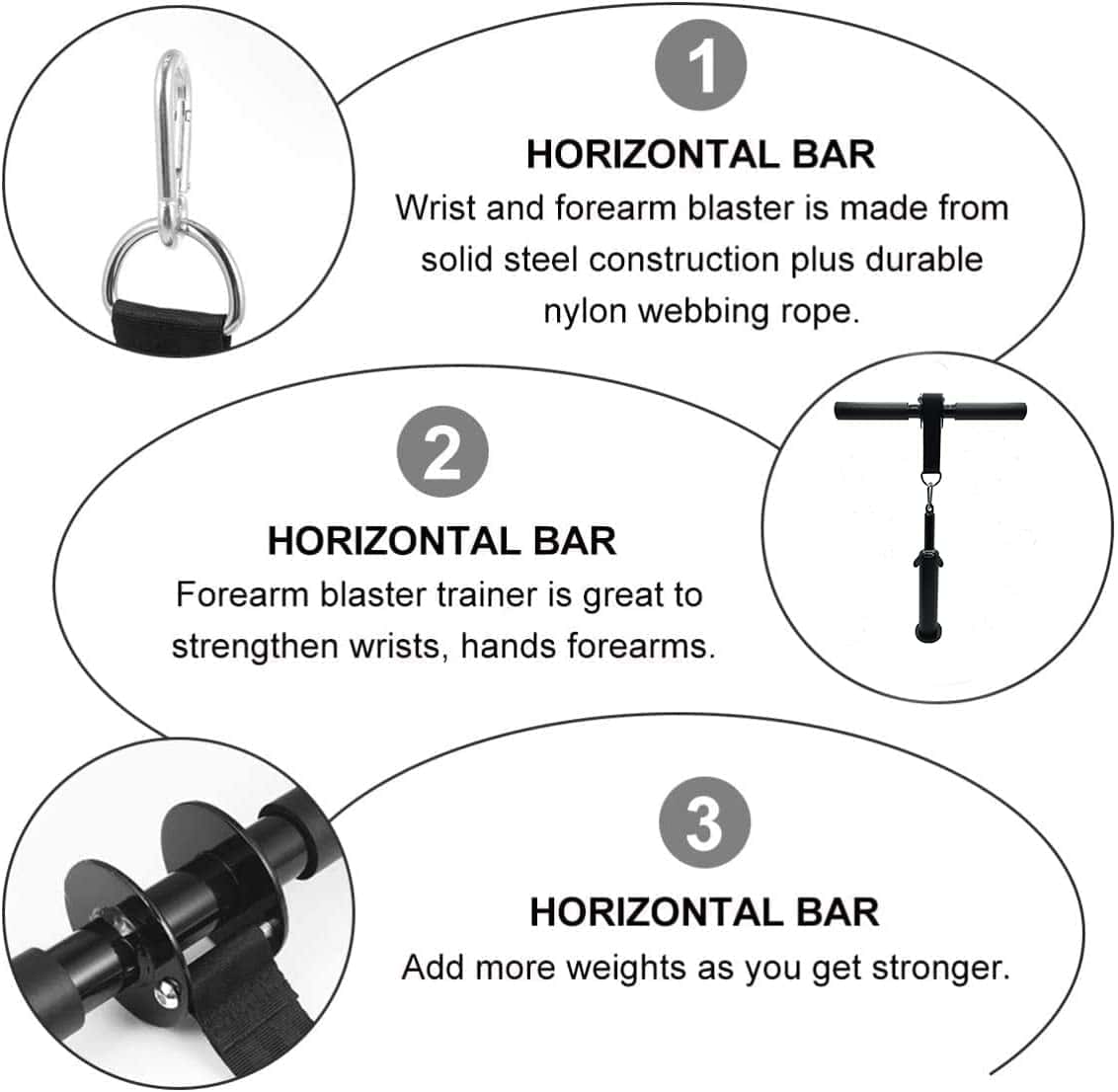 5. Fácil de usar: así es cómo funciona: Paso 1, enrolla el peso hasta que llegue al mango; Paso 2, enróllalo de vuelta lentamente y repite tantas repeticiones como puedas. ¡Vuélvete más fuerte con nuestro fortalecedor de muñeca! Nuestro kit de fortalecedor de antebrazos incluye 1 ejercitador de antebrazos, Mosquetones de escalada, Kits de plástico, pasador de carga, clips.