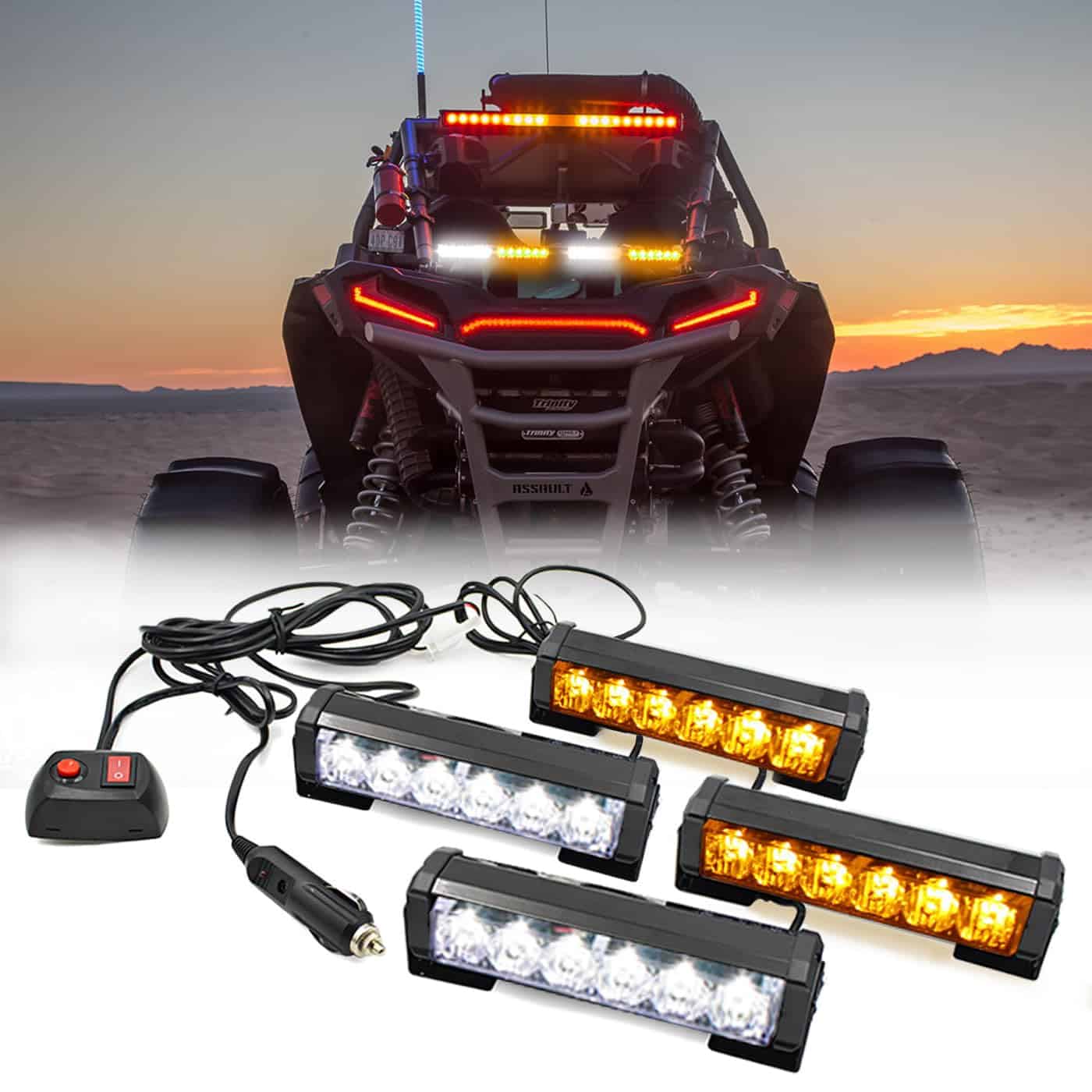Compatible con: Todos los vehículos equipados con una fuente de alimentación de 12 voltios. Características adicionales: 7 diferentes patrones estroboscópicos seleccionables con solo pulsar un botón para recorrer los modos. Más brillante y más eficaz que las luces estroboscópicas LED estándar. Hasta 30.000 horas de vida útil. Visible durante las condiciones diurnas. Especificaciones: Cableado: Más de 7 pies de cableado desde la unidad al interruptor de alimentación y selector de modo. Dimensiones: 6.25 pulgadas (ancho x alto). Voltaje requerido: 12V DC. Número de bloques LED: 4. Número de modos: 7. Número de LED por bloque: 6. Modos de flash: 1. Mantener estable. 2. Sincronizar estroboscópico. 3. Sincronizar. 4. Cruz estroboscópica. 5. Flash cruzado. 6. Sincronizar flash y sincronizar estroboscópico. 7. Sincronizar estroboscópico y luego sincronizar flash. 8. Una se enciende en un segundo mientras que el otro estroboscópico. 9. Ciclo automático. El producto incluye: 1 juego de 4 luces LED de asesor de tráfico estroboscópico, Tornillos de instalación y tuercas. Manual de instrucciones no incluido. En la mayoría de los casos, esta instalación requerirá perforar agujeros. No asumimos ninguna responsabilidad en enseñarle cómo instalar. Se recomienda encarecidamente la instalación profesional. Preguntas: Póngase en contacto con nosotros a través de mensajes de Amazon.