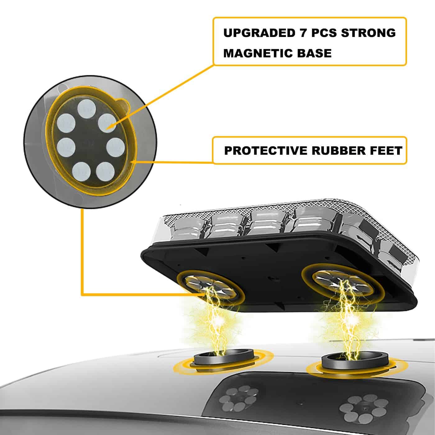 4. FÁCIL INSTALACIÓN Con 2 potentes bases magnéticas y 14 imanes en su interior, se mejora efectivamente la fuerza de adhesión. Es fácil de sujetar al techo firmemente y está equipado con almohadillas de goma protectoras y ventosas para que no se caiga incluso a altas velocidades.