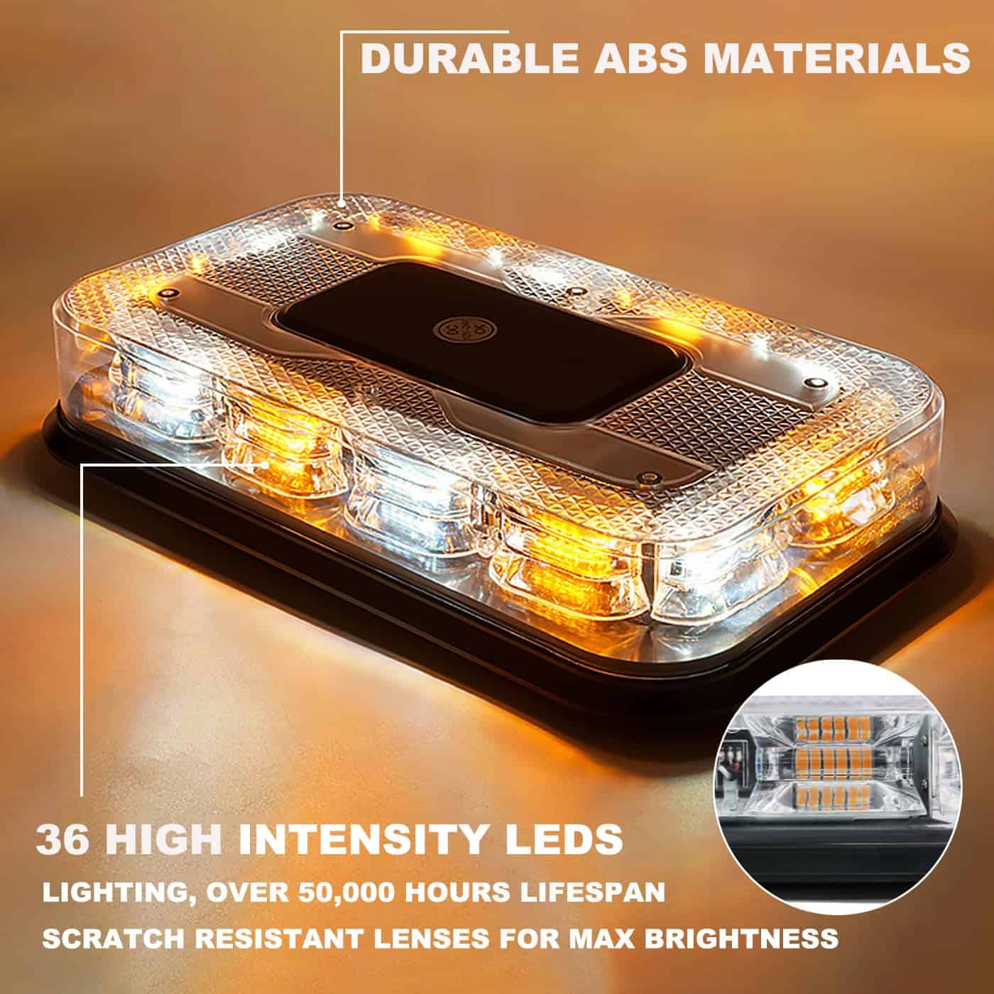 1. BRILLANTE ILUMINACIÓN FOXCID Luz intermitente mini barra de luces cada unidad viene con 36 piezas de chips LED de alta intensidad y potencia para mejorar el alcance de advertencia a 700FT. Lentes de PC transparente cortadas en cristal para una luz más brillante, día o noche. Muy adecuada para la aplicación en vehículos de Policía, vehículos no oficiales, quitanieves, camiones de remolque, vehículos postales.