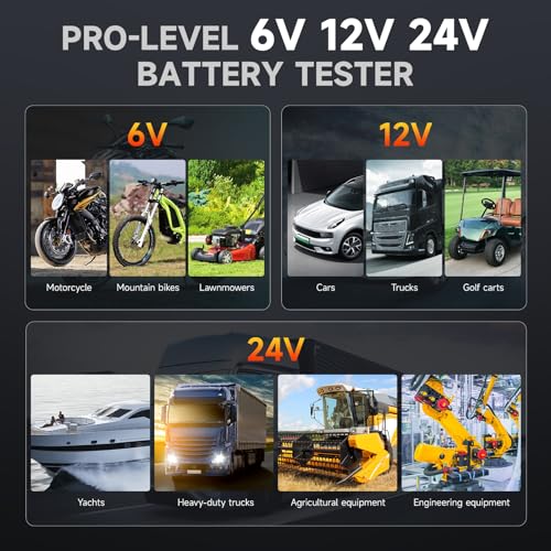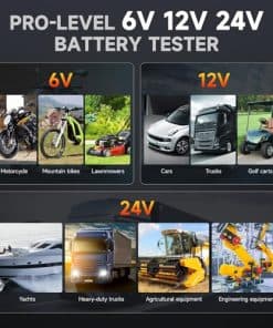 1. Probador de batería de nivel superior: Como la versión mejorada de BT705, BT780 puede probar todas las baterías de 6V 12V 24V 100-2000CCA, incluidas las regulares, AGM de placa plana, AGM espiral, gel, AGM de arranque-parada y EFP. El probador de batería agm perfecto para diagnosticar las baterías de bicicletas de montaña, cortadoras de césped, coches, camiones, autobuses, trenes, barcos, yates, carros de golf, camiones pesados, equipos agrícolas e ingeniería. Mejora tu juego de herramientas con la precisión del BT780 al alcance de tu mano.