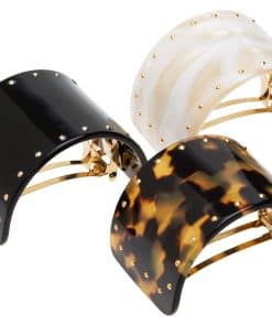 La pinza para cola de caballo con tachuelas de France Luxe es una elegante alternativa a las bandas elásticas. Hecha a mano en Francia y pulida a la perfección, el exclusivo sujetador para cola de caballo cuenta con un cierre estilo Barrette francés, convirtiéndolo en una solución de estilo versátil para cualquier ocasión. Con su diseño moderno con recortes y acabado lustroso, este clip con tachuelas de latón es una adición llamativa a tu conjunto. Características del producto: – Hecho a mano en Francia – Ideal para la mayoría de los tipos de cabello – Resistente cierre tipo barrette francés – Hecho de acetato de celulosa y latón – Dimensiones: 1 1/2″ de ancho, 2 1/4″ de largo