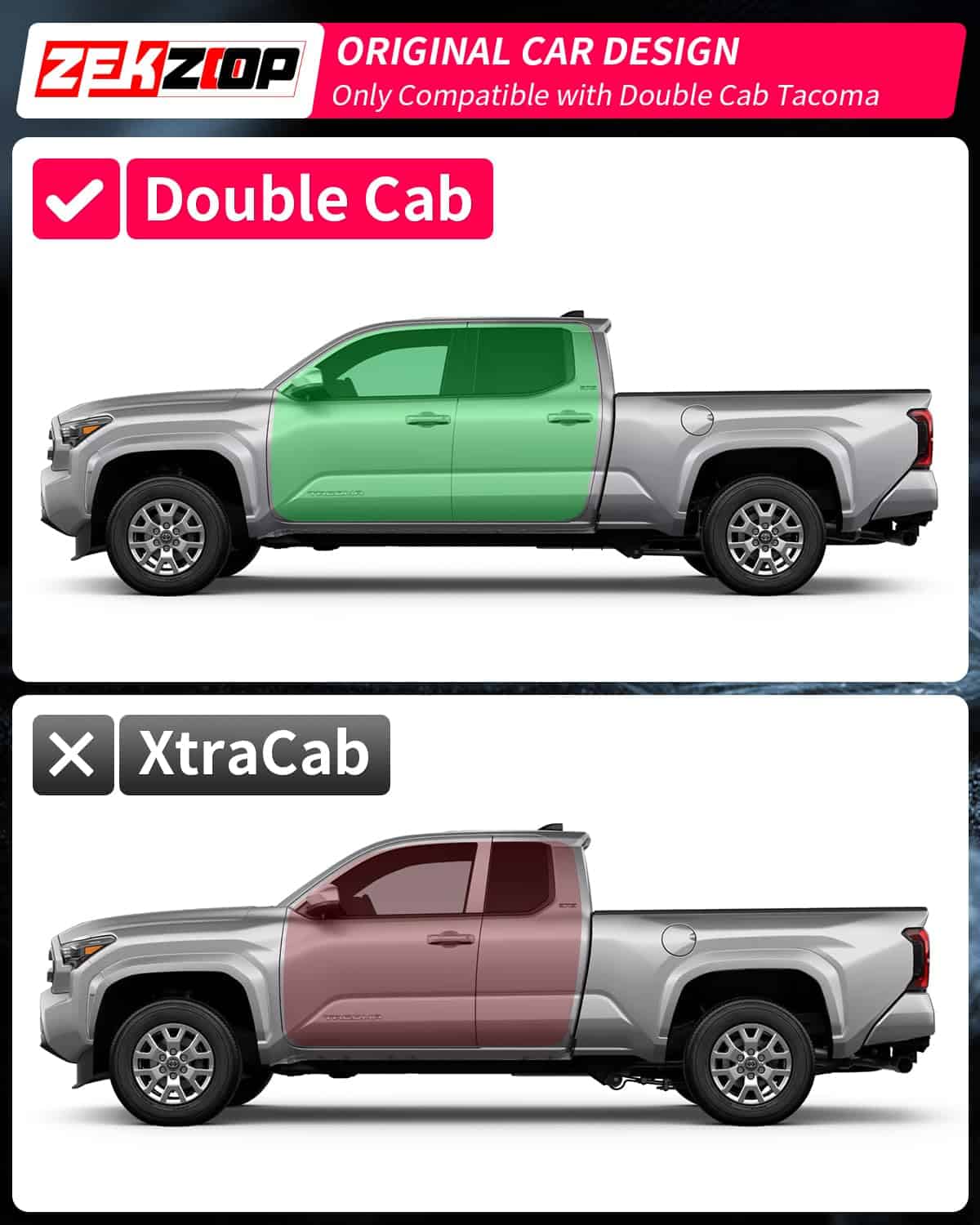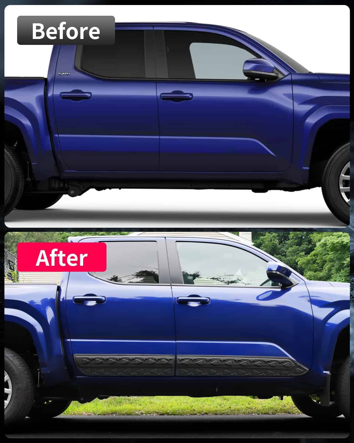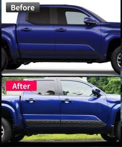 1. Compatibilidad: Las franjas de moldura de puerta son compatibles con Toyota Tacoma 2024 2025, asegurando un ajuste preciso de acuerdo al diseño original del automóvil. Nota: Solo apto para Tacoma Double Cab 5 Asientos, no para XtraCab 2 Asientos.