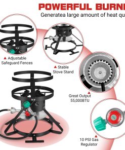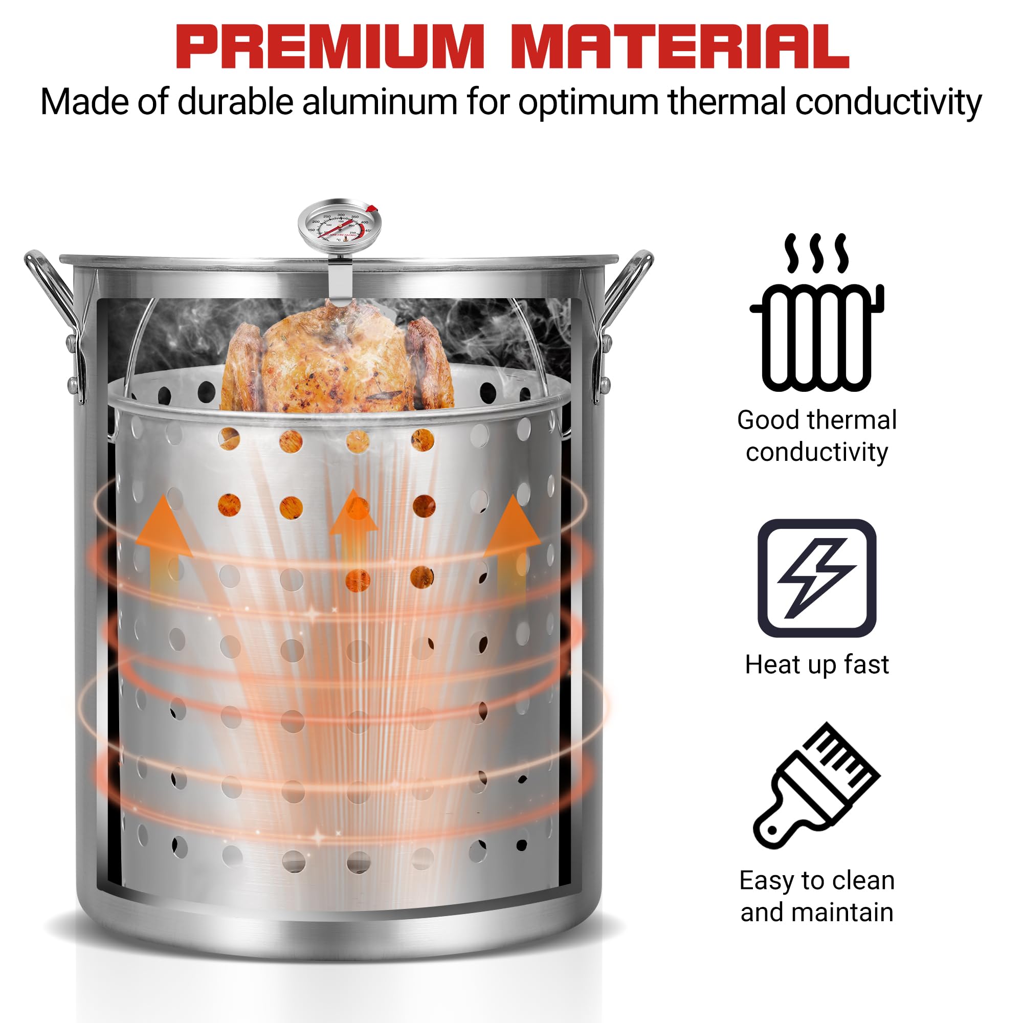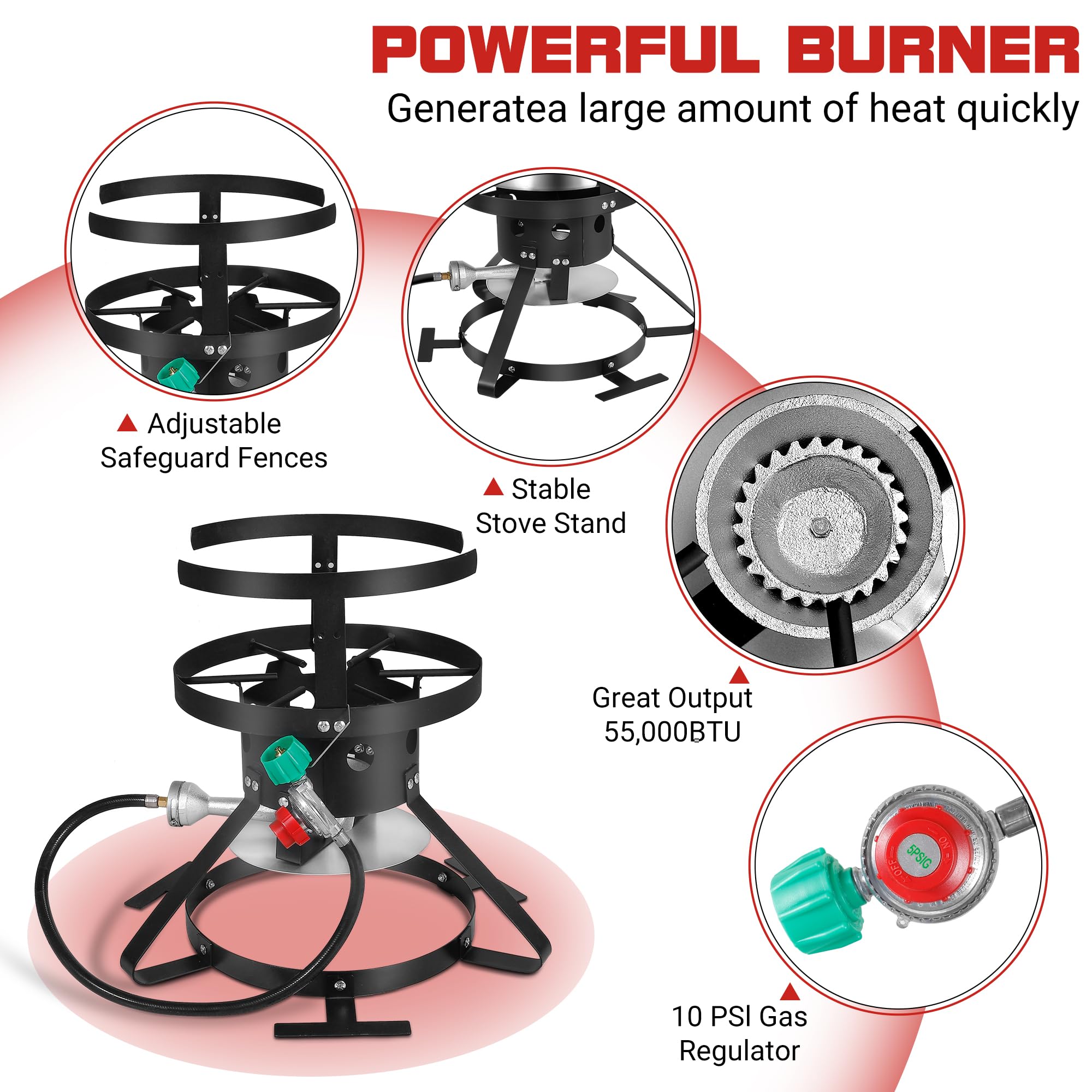 3. QUEMADOR DE ALTO RENDIMIENTO: Construido con hierro fundido, el quemador de propano de 55,000 BTU calienta eficientemente para freír a fuego lento incluso los pavos más grandes. La duradera construcción de aluminio garantiza un rendimiento duradero.