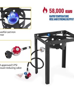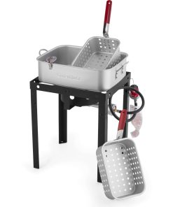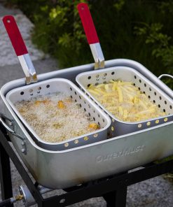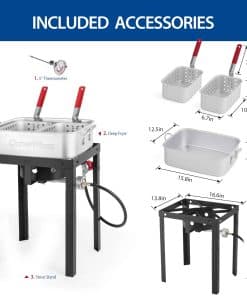 La cabeza de la estufa de esta freidora de propano está hecha de hierro fundido resistente con una potencia de salida de 58,000 BTU. Nuestro regulador ha recibido certificación CSA y cada parte es cuidadosamente examinada antes de ser enviada para que puedas confiar al 100% en nuestra freidora exterior. Viene con una válvula reductora de presión de 5PSI para maximizar la seguridad y se enciende por ignición manual. Con dos canastas internas para un fácil drenaje, diseño colgante que facilita el drenaje, y alimentada por propano, esta freidora es fácil de instalar y usar en menos de 30 minutos. ¡IMPORTANTE: NO coloques una olla vacía en el quemador mientras cocinas para evitar daños!