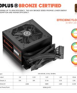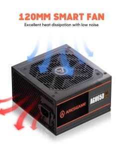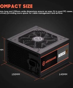 Introducción del Producto: –La ARESGAME AGV650 es una fuente de alimentación de gama alta con certificación 80plus Bronze y 85% de eficiencia, especialmente diseñada para juegos. –Aspecto sencillo pero que proporciona una salida de potencia fuerte y muy estable, esta fuente de alimentación permite a muchos entusiastas de los juegos disfrutar de cada momento de lucha. Características: —-Aspecto Encantador: La carcasa revestida de SECC negro, los cables y conectores negros y el ventilador negro ayudan a dar un aspecto de alta tecnología a su sistema —-Alta Eficiencia: certificación 80 plus Bronze, con una eficiencia del 85% o superior bajo cargas típicas —-Salida Estable: ofrece a su sistema voltajes de salida más fiables y estables, proporcionando una entrega de energía más consistente —-Ventilador Ultra Silencioso de 120 mm: con control inteligente de la velocidad del ventilador —-Excelente Disipación de Calor: diseño de ventilación en forma de panal combinado con la función del ventilador para una mejor disipación del calor —-Soporte de Tarjeta VGA de gama alta con conector moderno PCI-E 6+2 pines —-Diseño de Cable Conveniente: Longitud de cable largo de al menos 500 mm que soporta cajas de alta gama y cumple con las necesidades de los usuarios de un perfecto manejo de cables —-Cable Mágico de Atadura: Ayuda a mantener ordenado su entorno informático y minimizar el uso del espacio —-Protección Completa: incluyendo OVP/UVP/OPP/SCP Especificaciones: –Modelo: ARESGAME AGV650 –Modular: No Modular –Vatios: 650W –Tipo: Fuente de alimentación ATX de escritorio –80 Plus: Certificado Bronze –Entrada VAC: 100V-240V –Tamaño del ventilador: 120 mm/4.72 pulgadas –Dimensiones del producto: 150mmx140mmx86mm/5.9×5.5×3.3 pulgadas Contenido del Paquete: 1 x Fuente de alimentación de 650W 1 x Cable de alimentación de CA 1 x Manual del usuario 1 x Guía de Instalación Rápida 1 x Probador 4 x Tornillos 4 x Ataduras de Cable