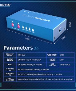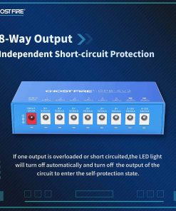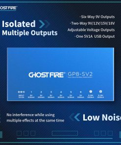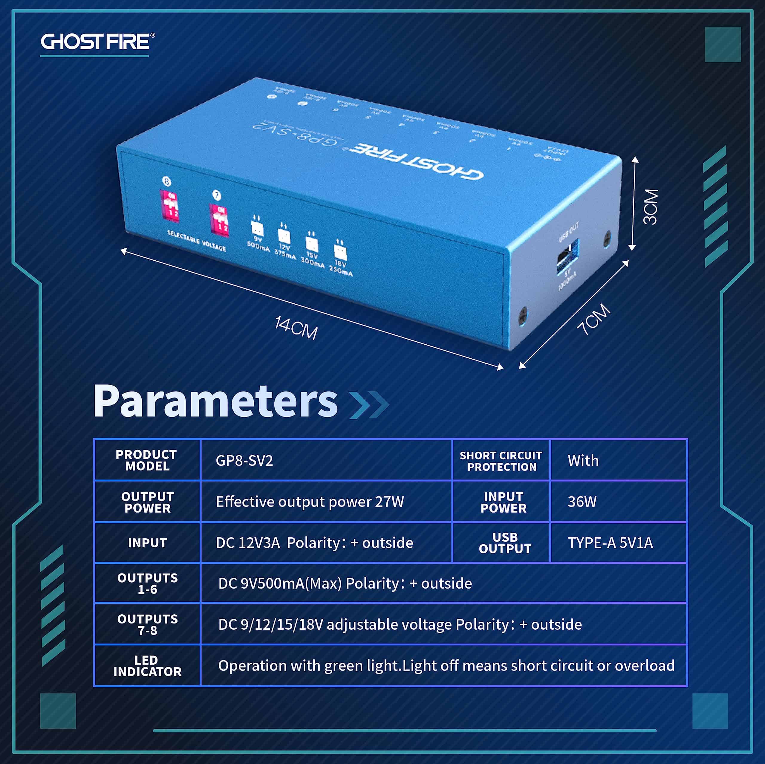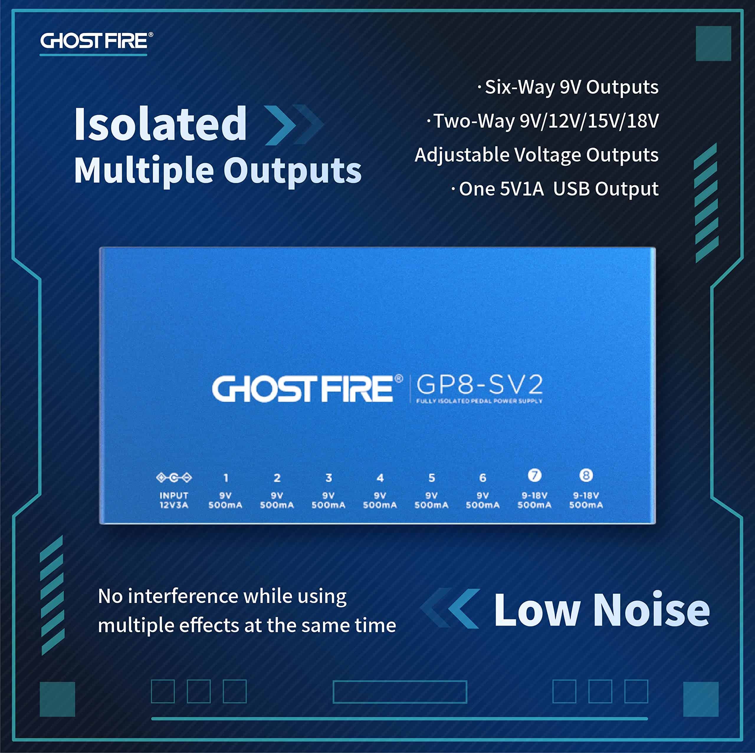 Fuente de alimentación de ocho vías para pedales de guitarra Ghost FIRE, con suministro de energía multi-canal completamente aislado: tiene seis salidas de 9v, dos voltajes ajustables de 9v/12v/15v/18v, y una salida de 5v1A USB, brindándote una variedad de opciones.