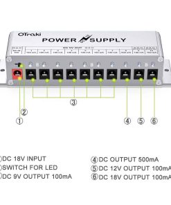 b Características de la Fuente de Alimentación para Pedal OTraki /b br Las salidas individuales permitirán que otras salidas continúen funcionando si surgen cortocircuitos. br Con 7 salidas de 9v (100mA), 1 salida de 9v (500mA), 1 salida de 12v (100mA) y 1 salida de 18v (100mA), puede alimentar diferentes pedales. br 10 LED azules para la iluminación de la pedalera e indicación de cortocircuito. br El cable de alimentación CC de 10 x 50 cm debería ser lo suficientemente largo incluso para las pedaleras más grandes. br br b Detalles del Producto: /b br Nombre del producto: b Fuente de Alimentación para Pedal /b br Marca: OTraki br Tamaño del cuerpo: 15.4 4.3 3.4 cm br Peso: 445 g br Entrada: CC 18 V, 1000 mA br br b Salida: /b br Salida CC 1 – 7 jack: 9 V, 100 mA br Salida CC 8 jack: 9 V, 500 mA br Salida CC 9 jack: 12V, 100 mA br Salida CC 10 jack: 18V, 100mA br br b Paquete Incluido: /b br 1x Fuente de alimentación para pedal OTraki br 1x adaptador de corriente br 10 x cable de alimentación CC de 50 cm br 2x cable de inversión de polaridad br 1x Manual de Usuario br br b AVISO: /b br Asegúrese de la polaridad positiva y negativa correcta antes de cablear (La polaridad incorrecta puede dañar esta unidad.