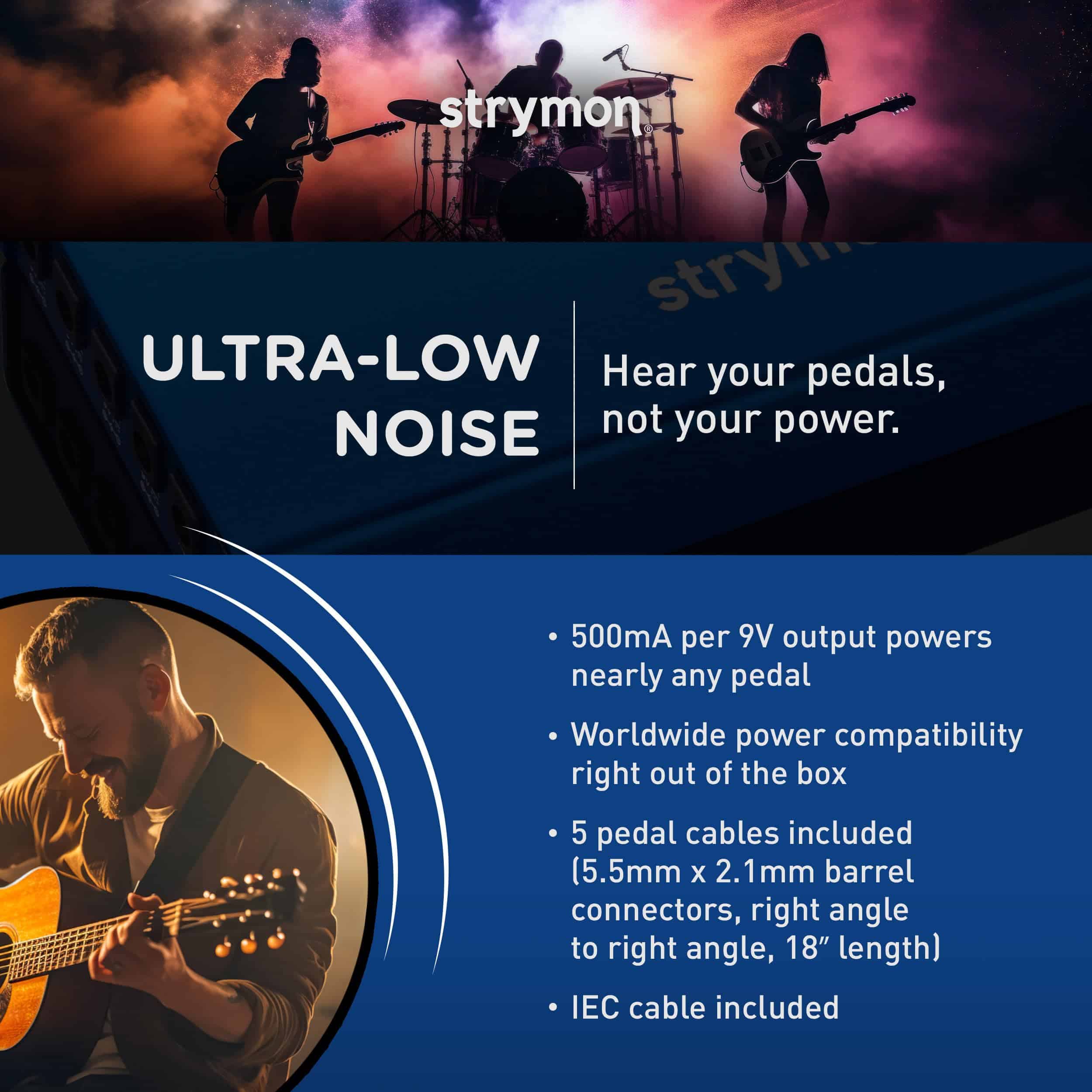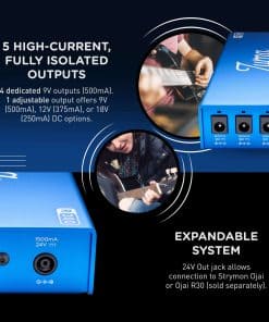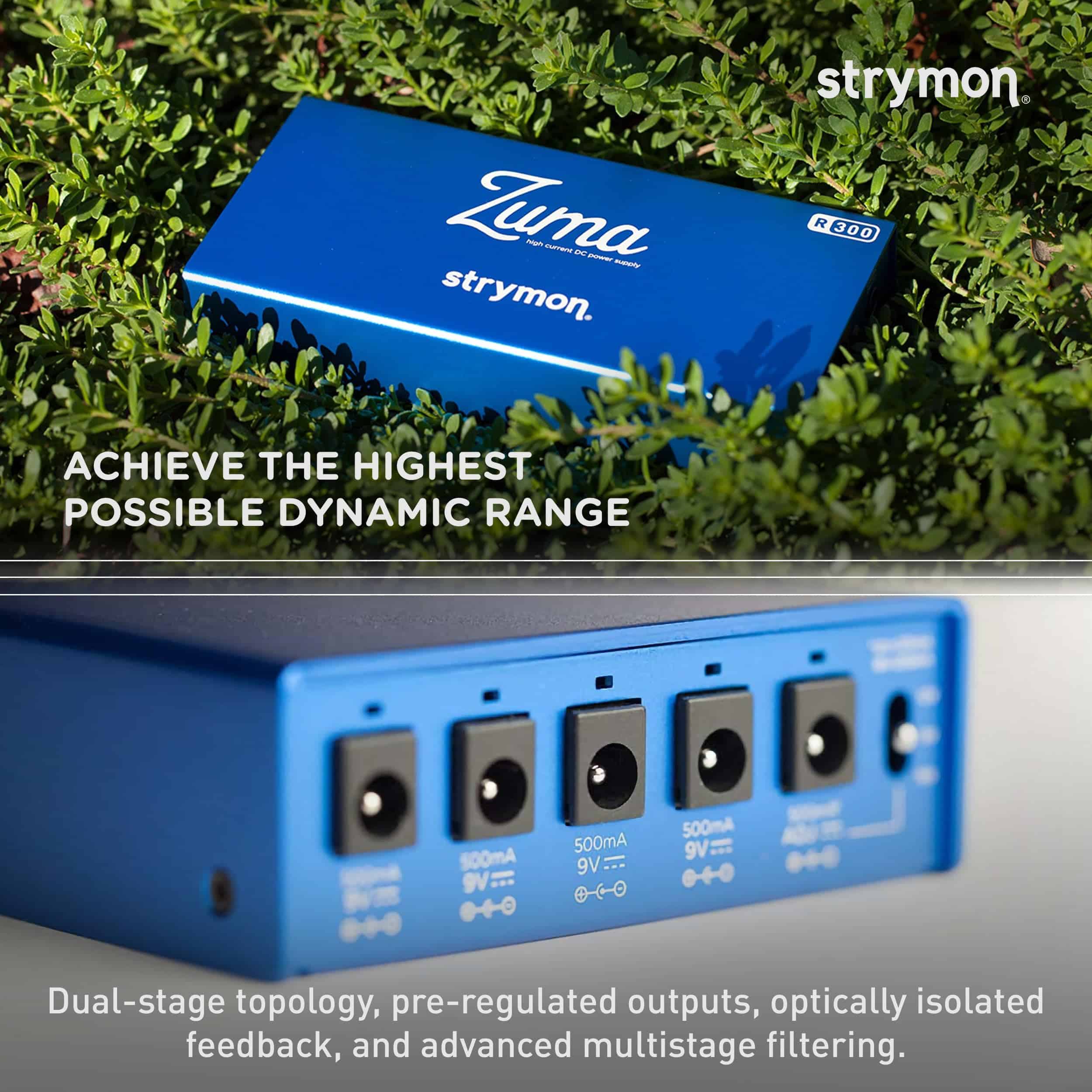 1. ALTO RENDIMIENTO La fuente de alimentación para pedales de guitarra Zuma R300 presume de alto rendimiento, operación silenciosa y confiable, y tecnología de vanguardia. Esta unidad de perfil bajo suministra 500mA por salida de energía limpia y estable a tus pedales de 9V, 12V y 18V, todo dentro de un diseño expandible compatible con pedaleras. 2. AISLAMIENTO DOBLE Esta fuente de alimentación para pedaleras cuenta con circuitos analógicos que proporcionan dos niveles de aislamiento, eliminando efectivamente problemas de bucle de tierra y ruido de línea de CA. Esto asegura que tus pedales suenen como fueron diseñados originalmente para sonar. 3. DISEÑO ULTRA BAJO PERFIL El notable diseño de bajo perfil del Zuma R300 le permite adaptarse perfectamente debajo de prácticamente cualquier pedalera. Su hardware enroscable incorporado garantiza un montaje sencillo en tu pedalera. 4. INFINITAS POSIBILIDADES DE SALIDA Para aquellos que necesitan expandir su equipo, el Zuma R300 se integra perfectamente en un sistema expandible. Simplemente conecta un Strymon Ojai o Ojai R30 usando la salida de 24V para obtener cinco salidas adicionales de alto corriente. 5. POTENCIA Y VERSATILIDAD MEJORADAS El diseño de dos etapas, las salidas de pre-regulación, la retroalimentación ópticamente aislada y el filtrado avanzado de múltiples etapas se combinan para crear una fuente de alimentación que permite que tus pedales alcancen su máximo rango dinámico.