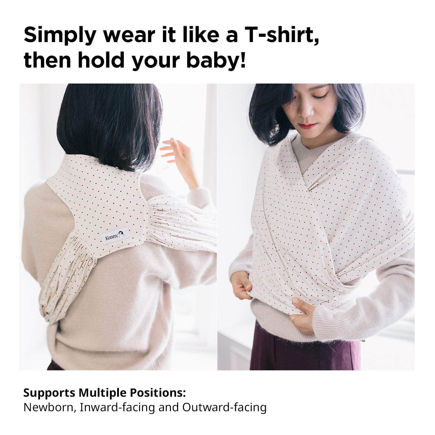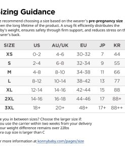 El Fular Portabebés Konny es la forma perfecta de reducir la carga (tanto de peso como de estrés) para cualquier padre con su diseño innovador, reconfortante y fácil de usar. Descubre cómo Konny puede hacer que la vida diaria de crianza sea más agradable. Simplemente colócate el Konny como una camiseta. Está libre de hebillas y envolturas complicadas, por lo que solo tienes que asegurarlo una vez. Diseñado pensando en padres activos, el portabebés ligero y compacto puede llevar fácilmente a un bebé. Distribuye uniformemente el peso del bebé por el cuerpo superior del usuario, minimizando el dolor de espalda, cintura y hombros. La tela finamente tejida y resistente ofrece a tu hijo un espacio cómodo para dormir y relajarse. La seguridad se une a la funcionalidad. El Konny ha pasado pruebas de seguridad basadas en el ASTM F2907 (Especificación de Seguridad del Consumidor Estándar para Portabebés) y está certificado para ayudar a tu bebé a desarrollar unas caderas saludables por la IHDI. Llevar el Fular Portabebés Konny de forma adecuada es el paso más importante para garantizar la seguridad y comodidad tanto para ti como para tu bebé. Hemos adjuntado un folleto con instrucciones detalladas, por favor toma el tiempo de leerlo atentamente. Guía de tallas. Recomendamos elegir una talla basada en la talla pre-embarazo del usuario dada la larga vida útil del producto. Un ajuste ceñido distribuye eficientemente el peso del bebé, garantiza la seguridad a través de un soporte firme y reduce el estrés en la espalda del usuario.