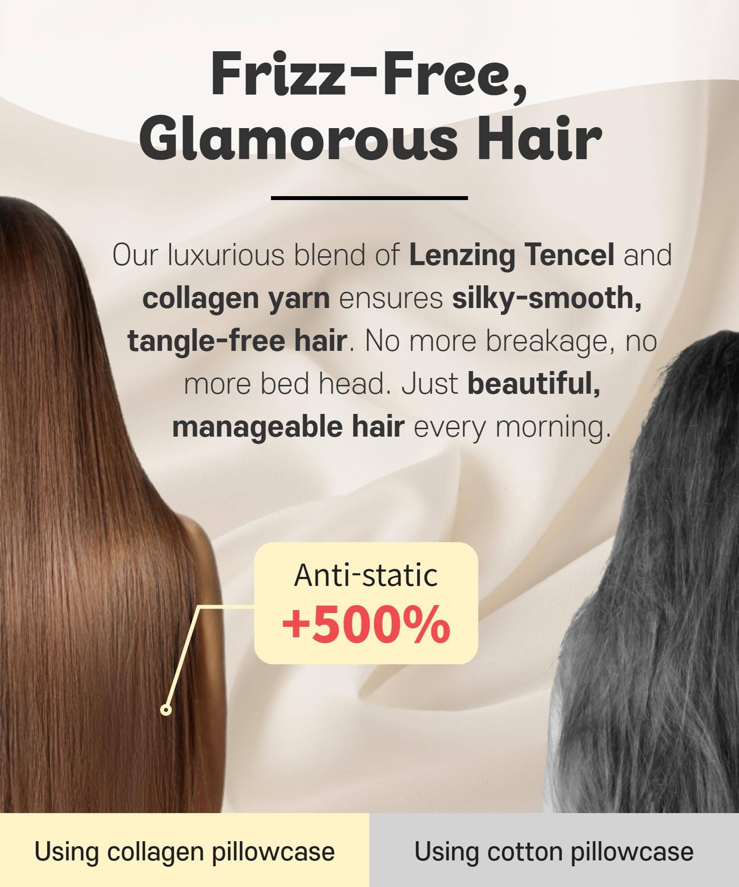 2. Cabello sin Frizz, Glamoroso – Nuestra lujosa mezcla de Lenzing Tencel y hilo de colágeno garantiza un cabello suave como la seda y sin enredos. No más roturas, no más cabello revuelto. Solo cabello hermoso y manejable cada mañana.