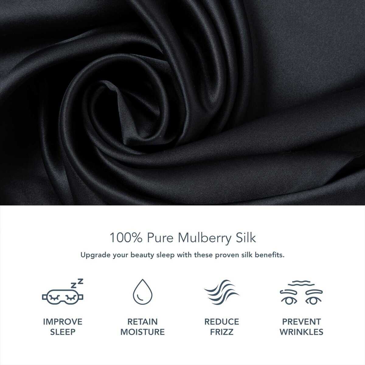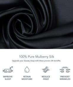 Funda de almohada de seda 100% pura de 25 mm de Fishers Finery, ganadora de Good Housekeeping, disponible en color Negro y tamaño Queen. Esta funda de almohada de lujo está hecha de seda de morera pura de hebra larga, Grado 6A. La densidad de seda se mide por momme, y esta funda de almohada tiene una alta densidad para ofrecer los máximos beneficios. La seda está presente en ambos lados de la funda de almohada, lo que proporciona una sensación suave y lujosa en cada uso. Además, cuenta con una entrada lateral única y una solapa de sobre dimensional para asegurar que la almohada permanezca en su lugar. Los beneficios para la salud de esta funda de almohada son numerosos, desde prevenir arrugas hasta regular la temperatura del sueño y proteger el cabello de daños. Con varias opciones de tamaño disponibles, este producto se adapta a diversas necesidades de cama. Las instrucciones de cuidado incluyen opciones de limpieza en seco, lavado a mano o lavado a máquina en el ciclo suave, junto con la sugerencia de secar en plano para mantener la calidad de la seda.