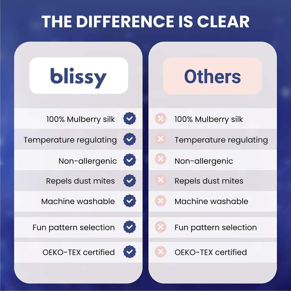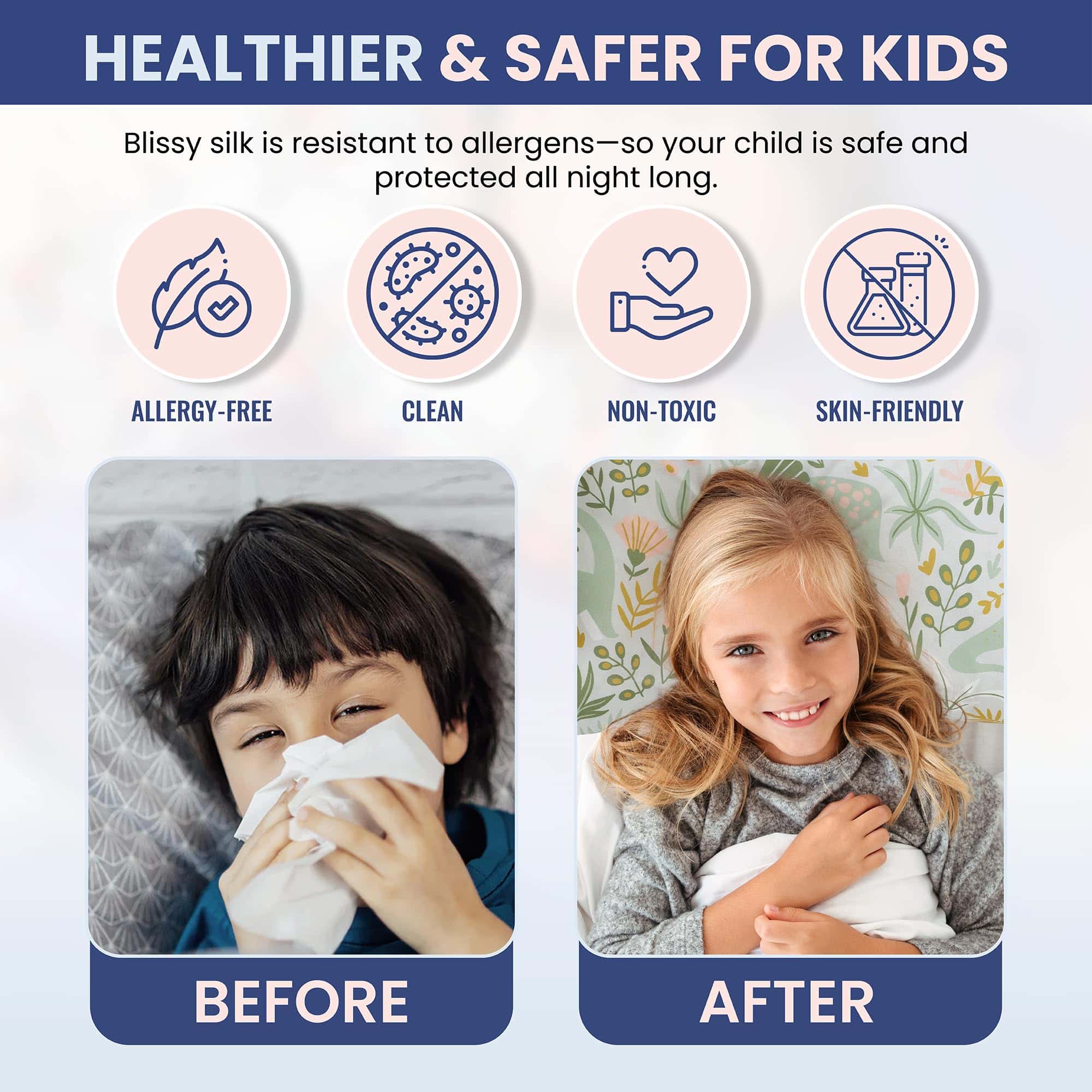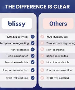 Mejor descanso y más fresco: Las propiedades reguladoras de temperatura de la funda de almohada de seda Blissy permiten que los pequeños se mantengan frescos en todo momento durante la noche sin la incomodidad asociada con la temperatura cambiantes y el constante moverse para una noche de sueño reparador. Solución amigable con la piel: Mientras que el algodón es un terreno fértil para los alérgenos, la seda es totalmente hipoalergénica, lo que significa que tus hijos pueden despertar con senos más despejados, ojos secos y una respiración fácil. Si tienen la piel sensible, también notarás menos enrojecimiento, hinchazón y imperfecciones al dormir en una superficie hipoalergénica como la seda. Cuidado fácil: Lavable a máquina y disponible en una variedad de colores y diseños, nuestra funda de almohada de seda permite que tu hijo exprese su personalidad mientras se mantiene fácilmente fresca y limpia. Calidad confiable: La etiqueta OEKO-TEX Standard 100 de Blissy garantiza que nuestras fundas de almohada de seda son seguras, ecológicas y no tóxicas, brindando tranquilidad tanto para ti como para tu hijo.