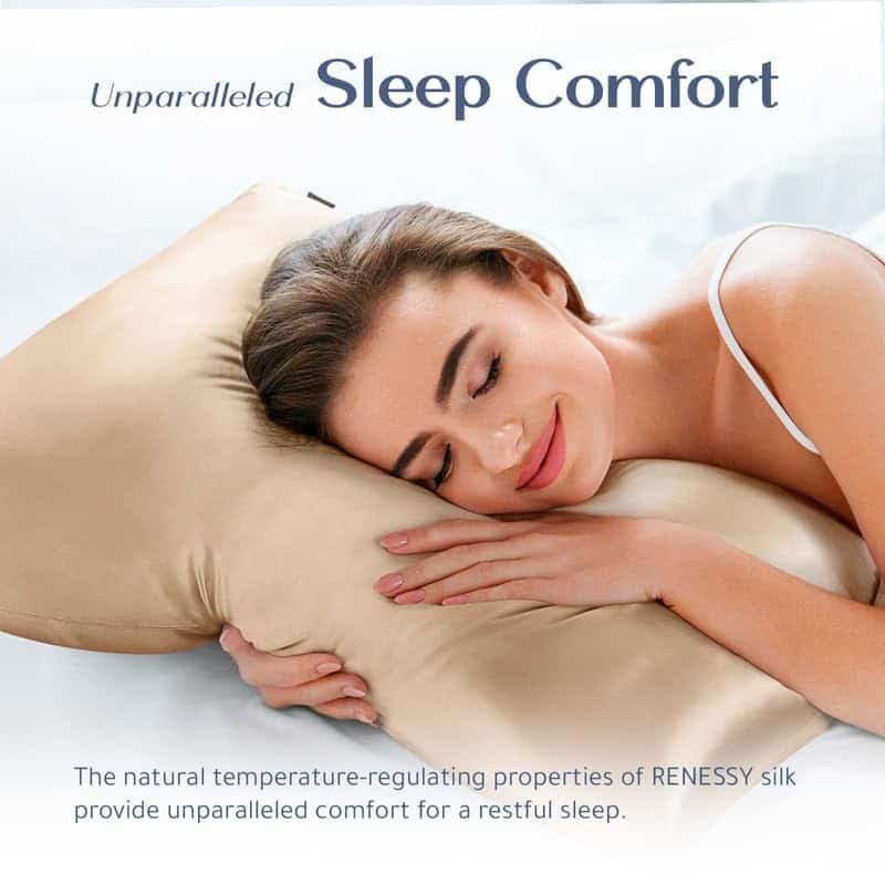 1. LUJO DE SEDA ORGÁNICA – Experimenta el lujo incomparable de la seda orgánica. Las fundas de almohada de RENESSY, elaboradas con un 100% de seda de morera orgánica en un tejido de Charmeuse, brindan un confort excepcional, transformando tu experiencia de sueño en un placer nocturno.
