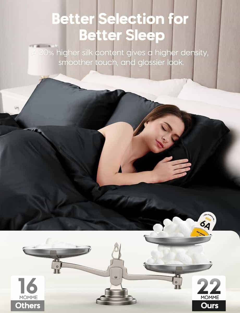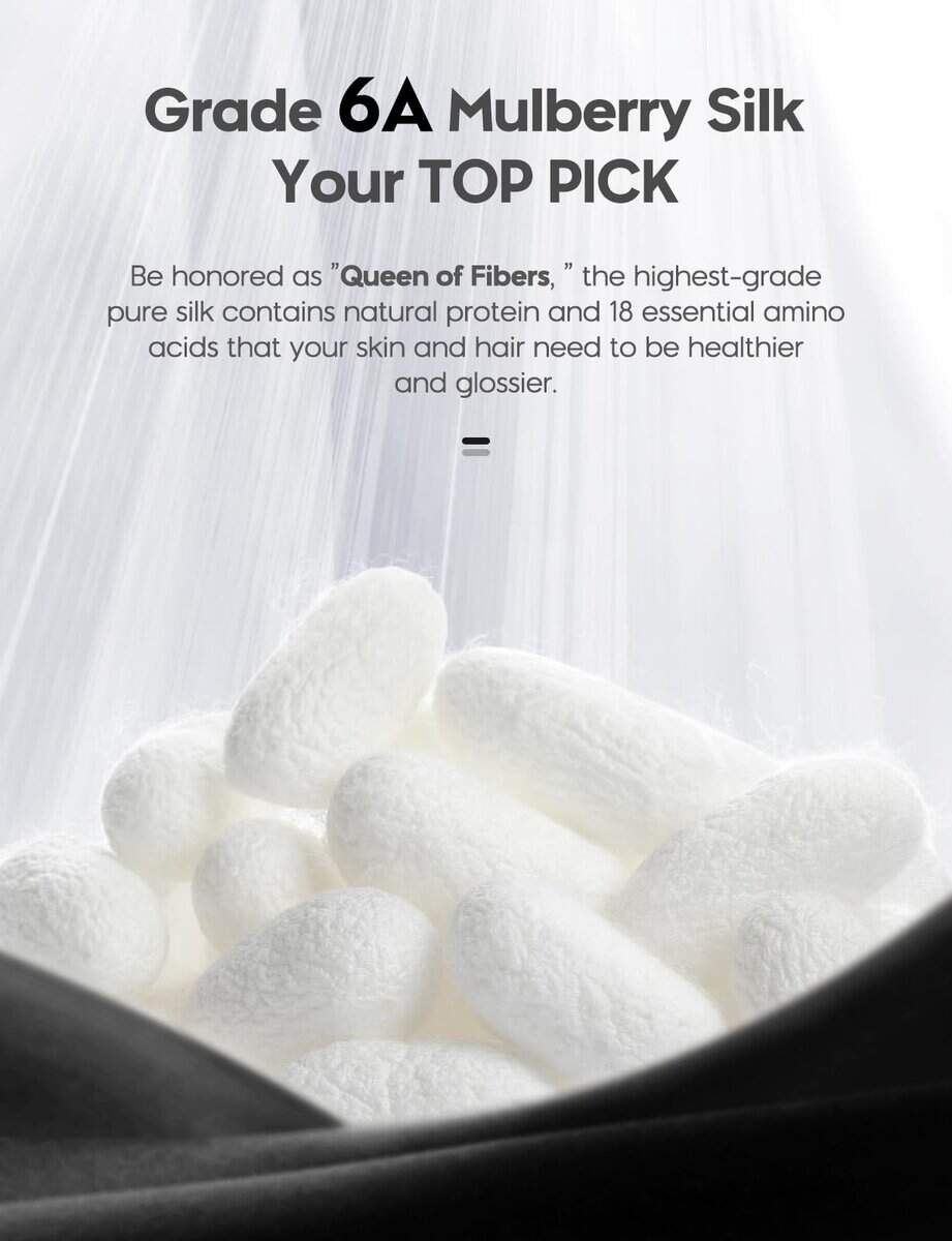 1. 22 Momme 100% Seda Pura de Morera. Creemos que las fibras cultivadas de la naturaleza son perfectas tal como son; por lo tanto, la seda conserva su pureza, permitiéndote experimentar el maravilloso poder otorgado por la naturaleza. Destacada como Reina de las Fibras, la seda pura de grado 6A contiene proteínas naturales y 18 aminoácidos esenciales que tu piel y cabello adoran.