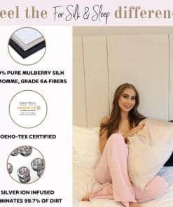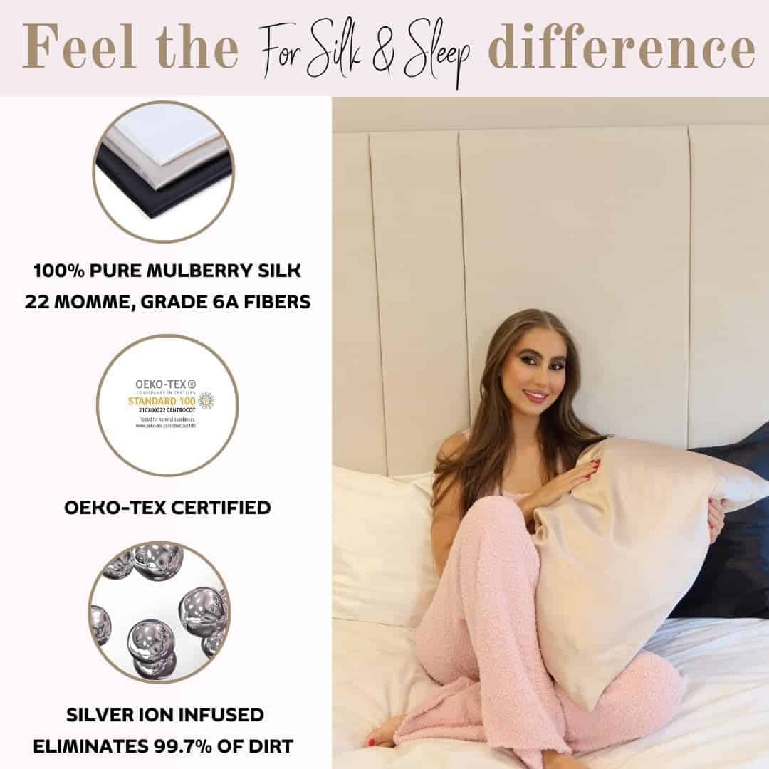 La funda de almohada de seda pura For Silk & Sleep de 100%, con 22 momme de seda mulberry, grado 6A y doble cara, es la herramienta de belleza más poderosa reconocida por expertos, dermatólogos y celebridades de todo el mundo. No solo nuestra funda de almohada es lujosa, sino también sostenible y respetuosa con el medio ambiente. Nuestra funda de almohada cuenta con certificación OEKO-TEX y está impregnada con plata natural, que proporciona una superficie esterilizada para que descanses. Ofrecemos una calidad premium en la que siempre puedes confiar. Di adiós al cabello seco, apagado y quebradizo y di hola a un cabello brillante, grueso y sedoso, todo gracias a dormir en una de nuestras fundas de almohada de seda mulberry 100% reales. Nuestras fundas de almohada de seda real están diseñadas para impresionar y tienen una textura ultra suave que ayuda a prevenir arrugas y a retener la humedad en tu piel. Es una funda de almohada de seda lavable que ha pasado por rigurosos controles de calidad e inspecciones. ¡Nuestra funda de almohada viene en una impresionante caja de presentación y está lista para regalar! ¡Despierta sintiéndote la mejor versión de ti mismo! Siente la diferencia For Silk & Sleep.