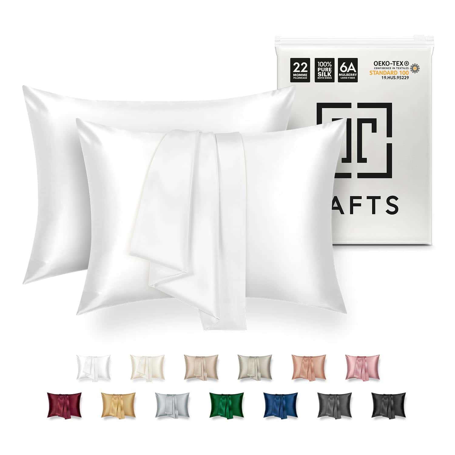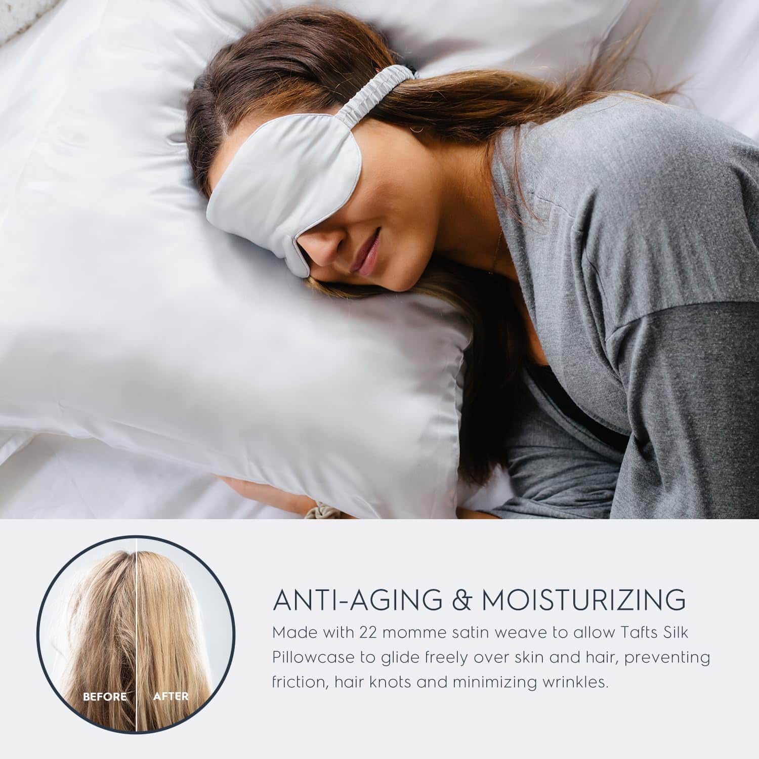 2. ANTI-ENVEJECIMIENTO E HIDRATACIÓN – Las fundas de almohada de seda Tafts están hechas de 100% Pura Seda de Morera (Grado 6A de fibra larga), que tienen propiedades naturales anti-envejecimiento que previenen el acné y las arrugas al mantener la piel hidratada y radiante. Se ha demostrado que las fundas de almohada Tafts absorben menos crema facial que las de algodón, por lo que pueden ayudar a mantener tu piel hidratada y mantener los aceites naturales del cabello o los productos donde pertenecen. Además, las telas de seda mantienen tus pestañas hermosas durante la noche.